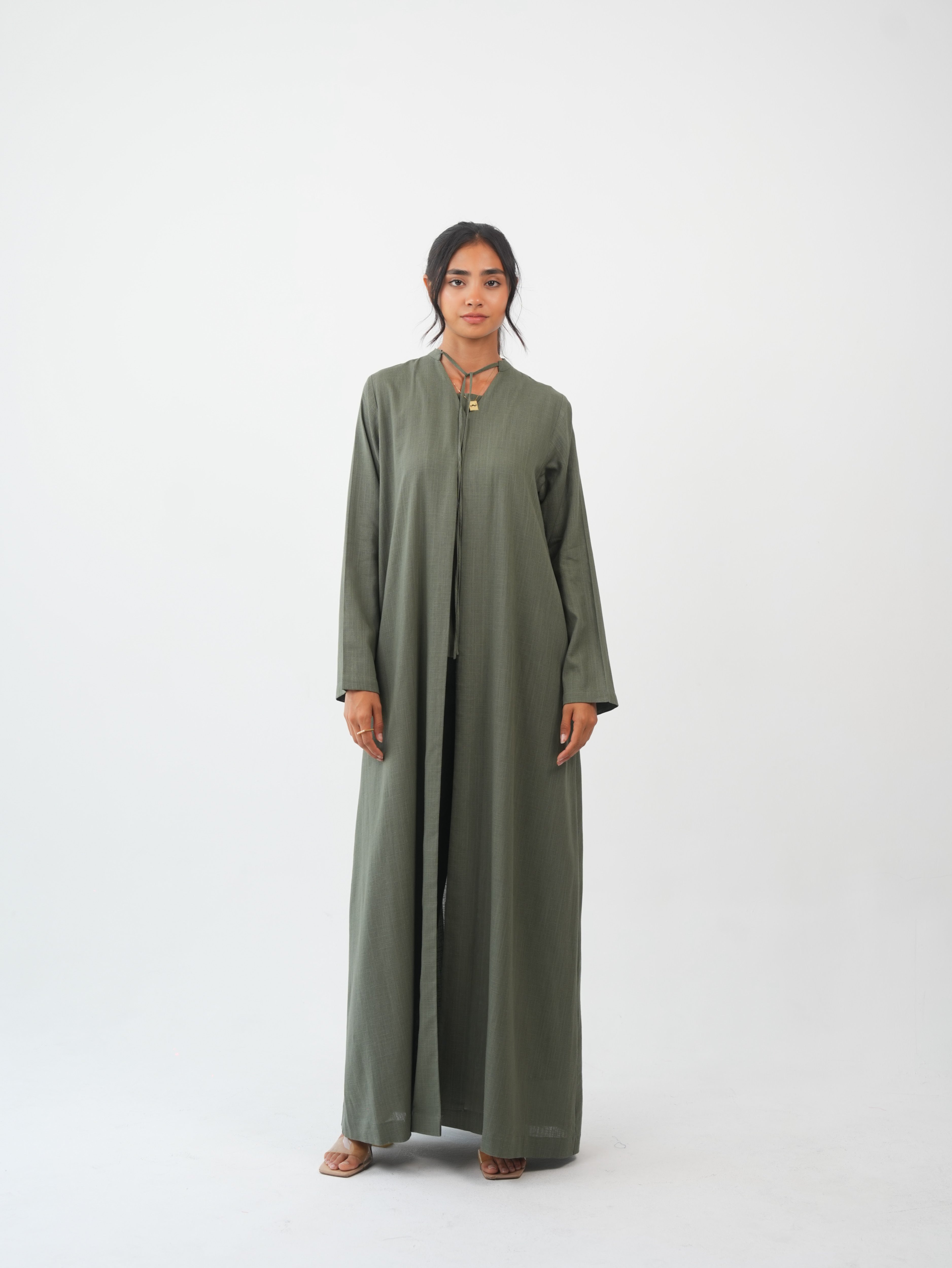 "Alya is a sleek-cut, long abaya designed for modern elegance. Perfectly paired with the Mira pants and top, it offers a refined, layered look that transitions effortlessly from day to night."