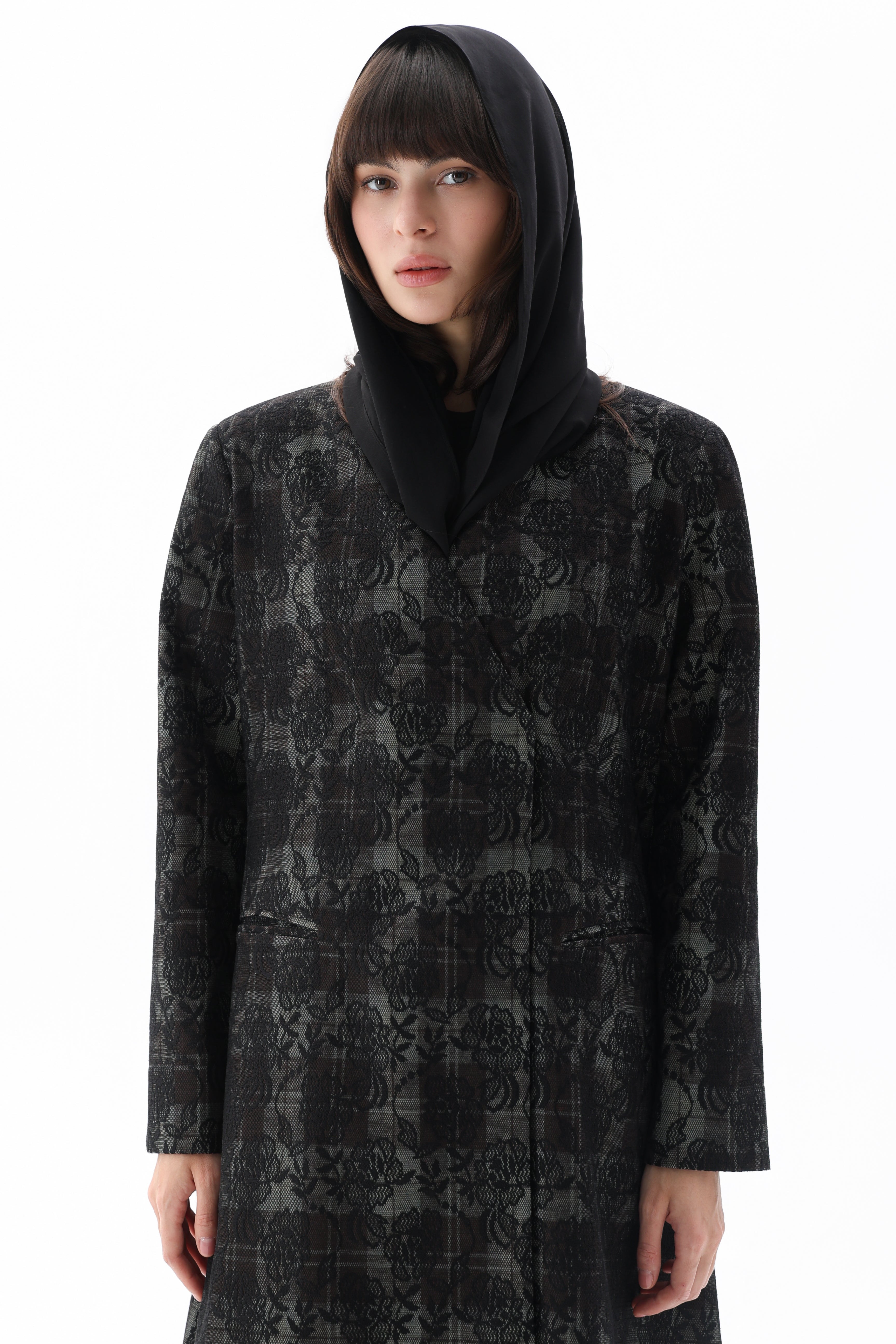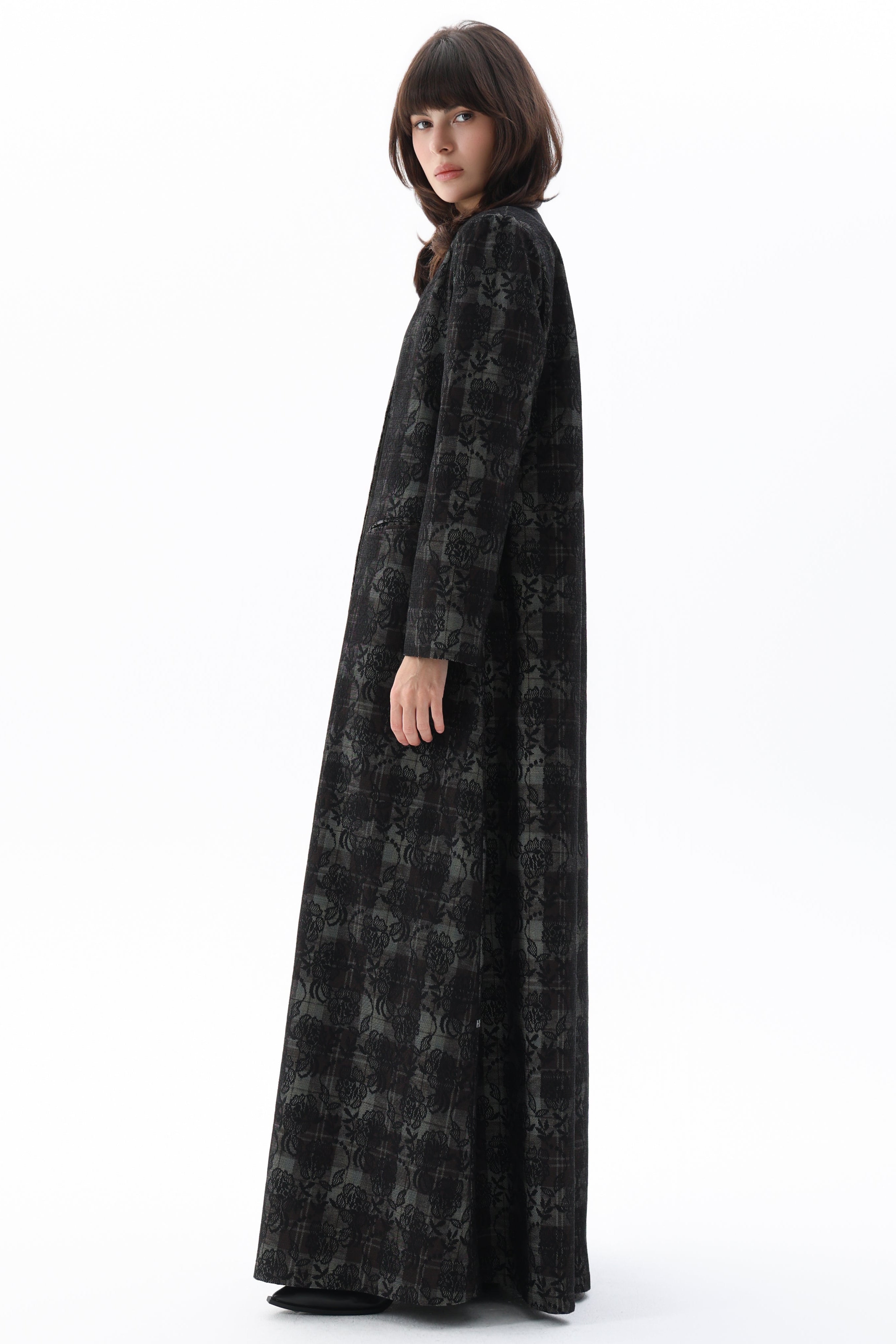 Bella-This black abaya features a contemporary blazer-inspired cut crafted from structured suiting fabric. French lace embellishments grace the top, introducing an elegant contrast that elevates the modern silhouette. Perfect for those seeking a refined piece that bridges traditional styling with contemporary tailoring and sophisticated detailing.