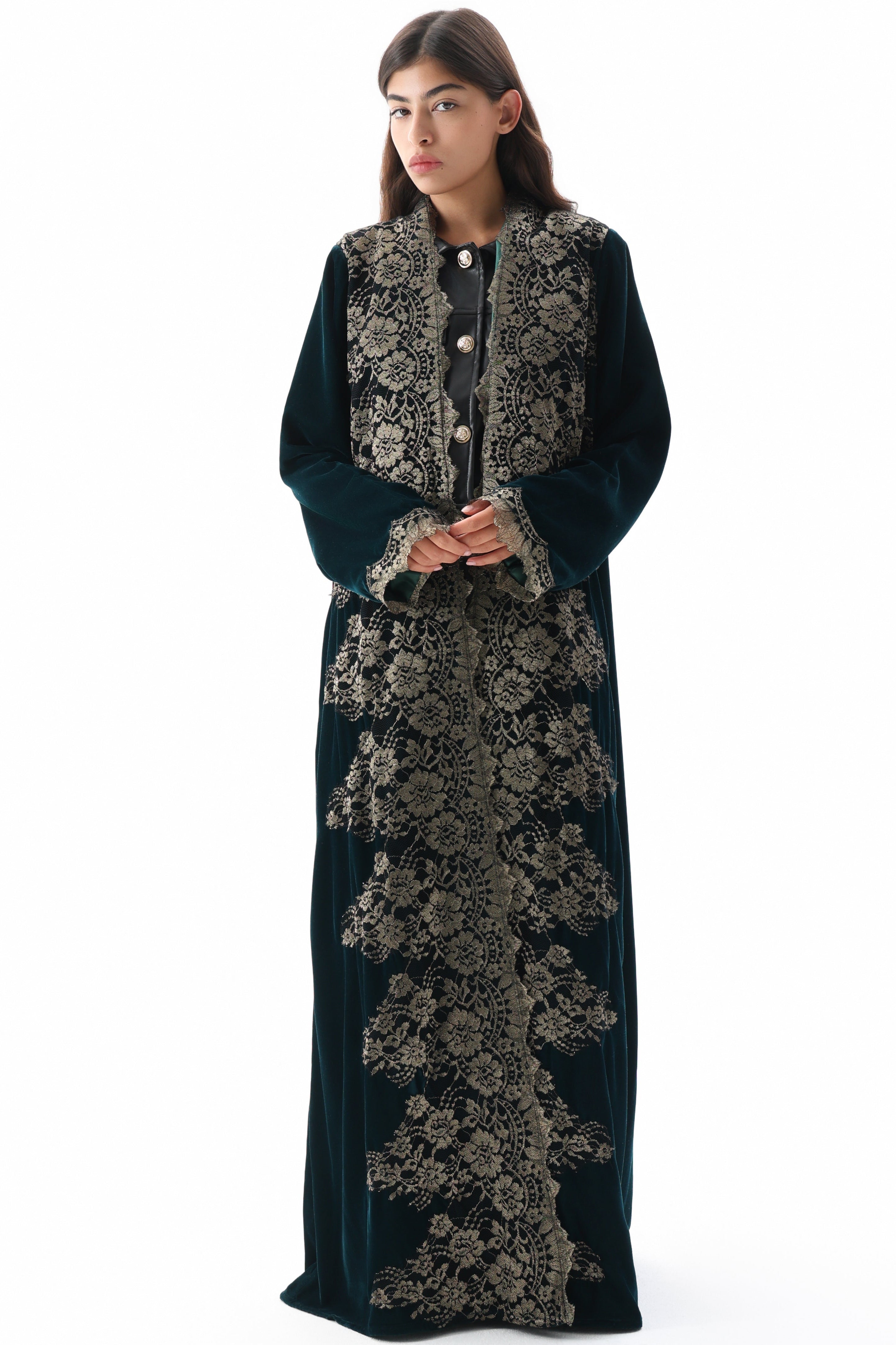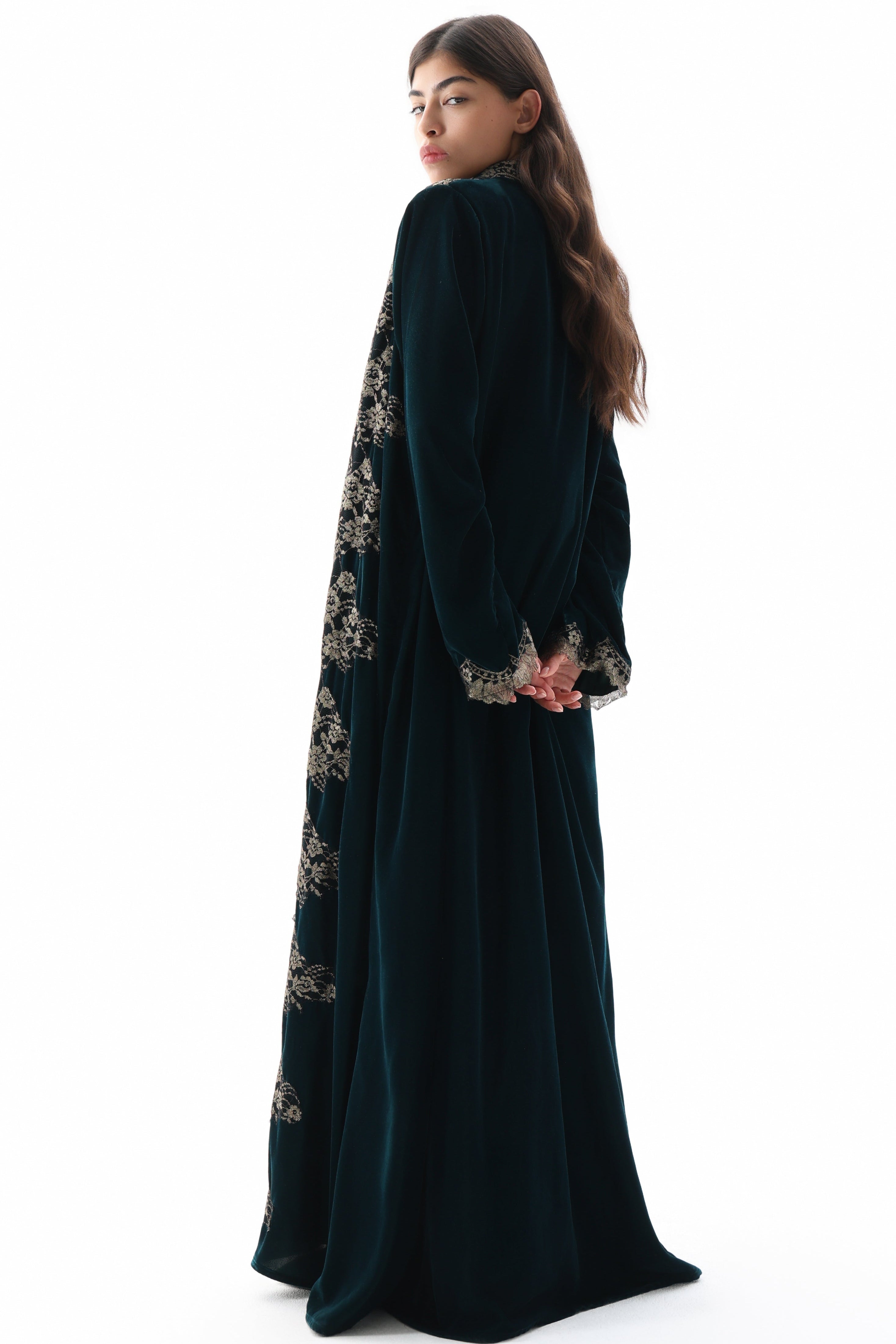Claire- Crafted from sumptuous velvet, this black abaya is elevated by the addition of exquisite French lace detailing. The combination of rich fabric and delicate lacework creates a refined aesthetic that appeals to those seeking timeless elegance with sophisticated embellishment.