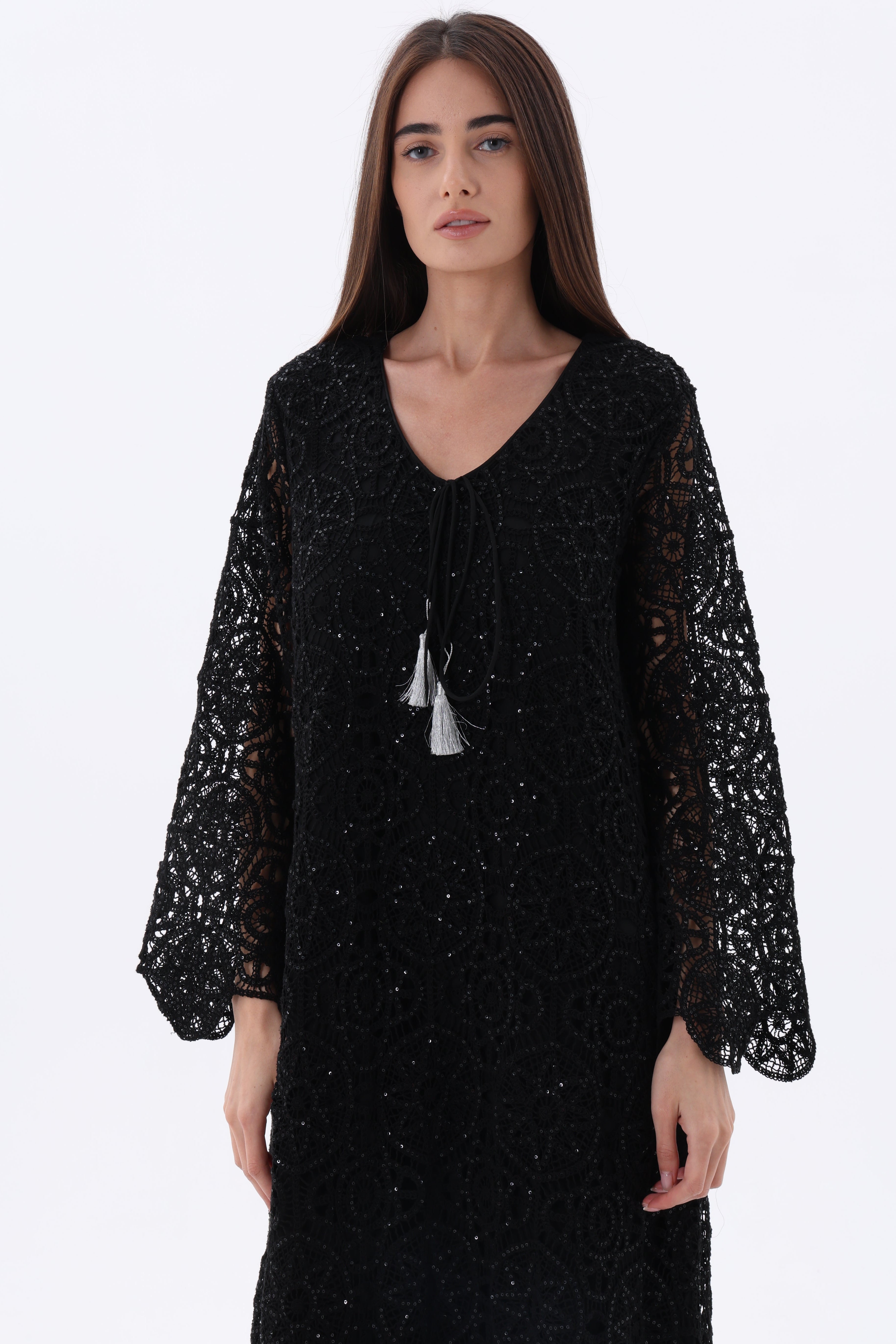 Dalia - Command attention with this striking kaftan that seamlessly blends intricate lace with shimmering sequin embellishments. The included tarbosh completes the sophisticated look, creating a cohesive ensemble ideal for celebrations and special moments. A statement piece that showcases meticulous artistry and glamorous appeal.