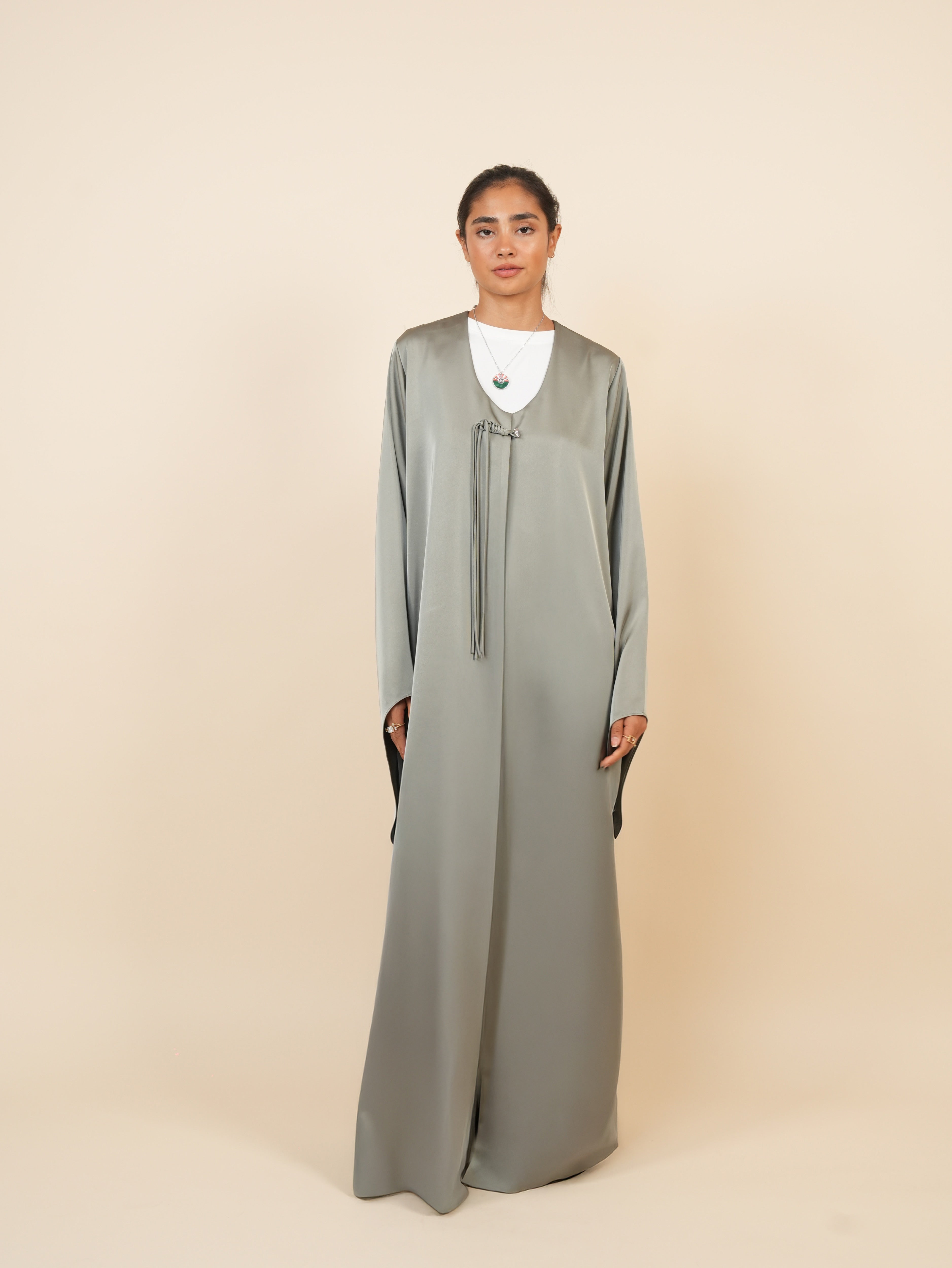 Fouz is a refined abaya that speaks elegance in every detail. The design features tiny loop accents, adding a subtle feminine charm while keeping the overall look decent, graceful, and timeless.