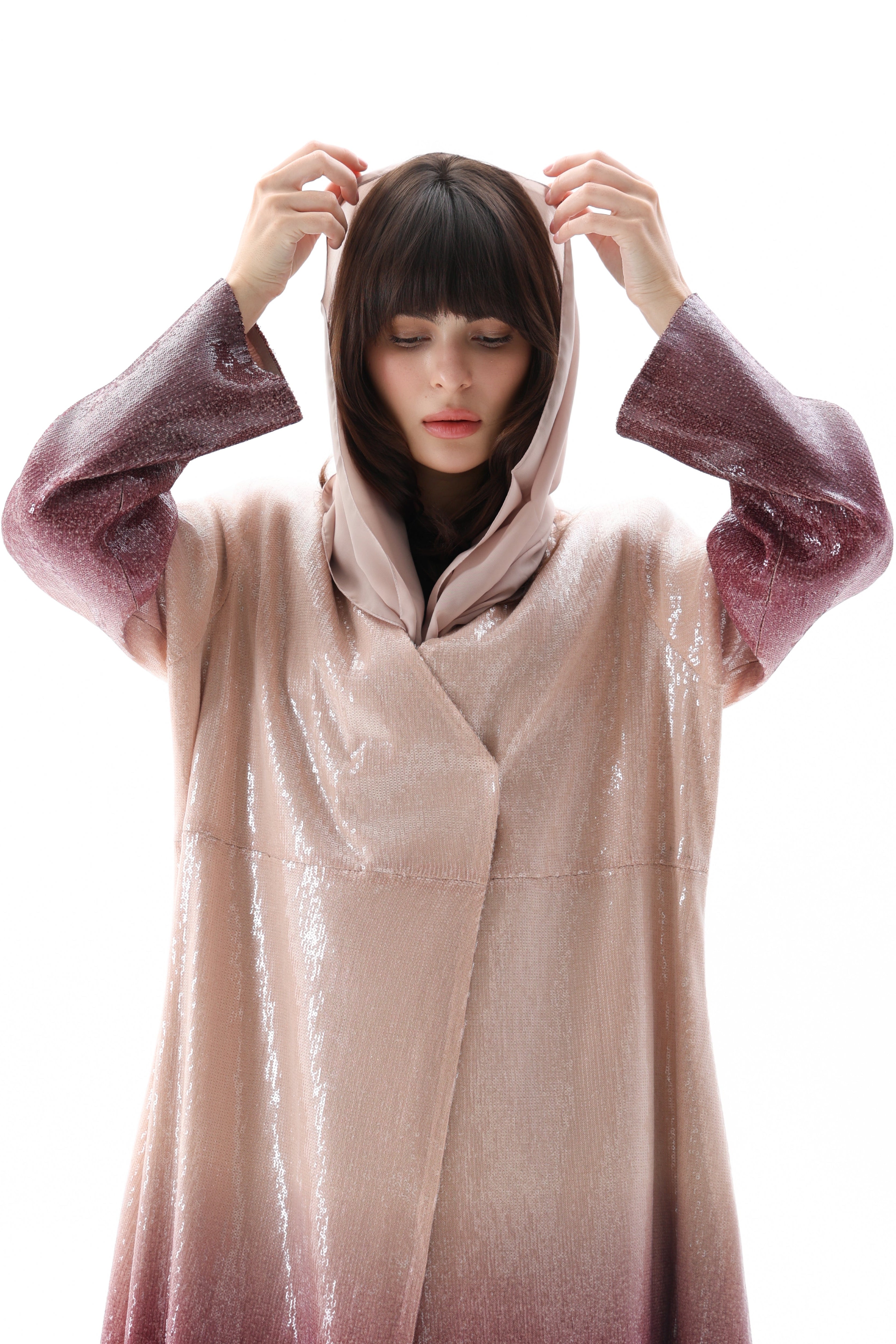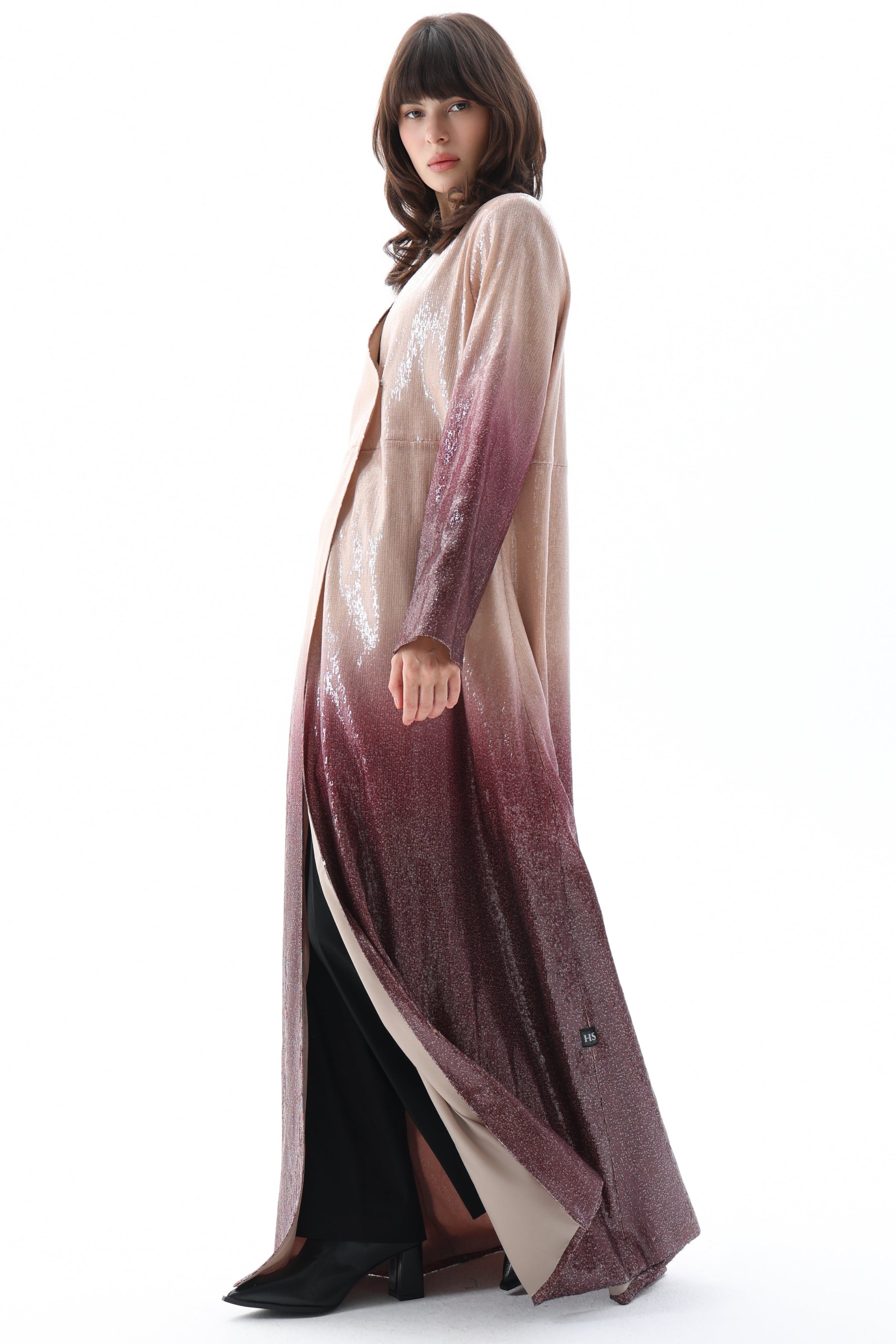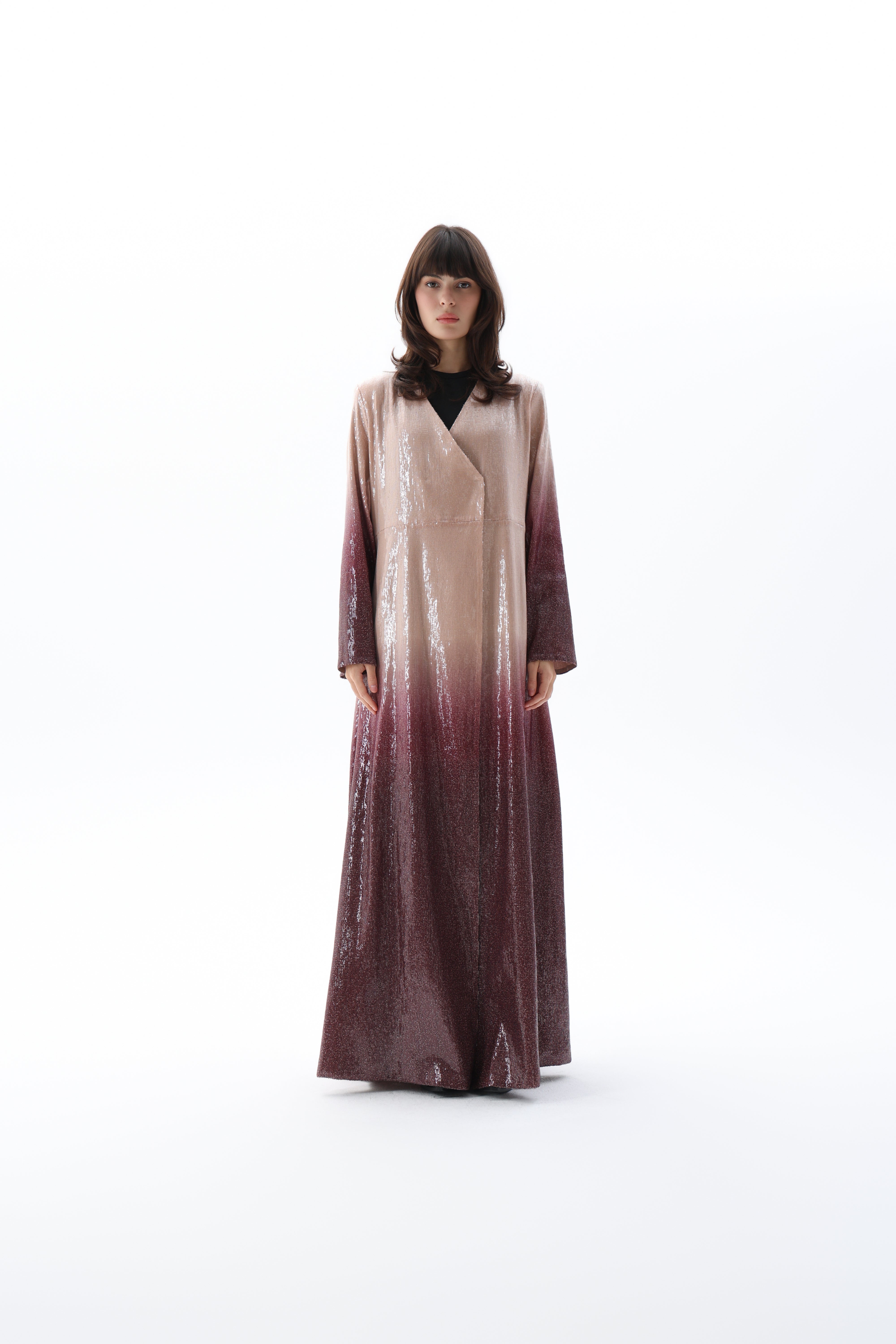 This maroon abaya features a contemporary blazer silhouette enhanced with shimmering sequin embroidery throughout.