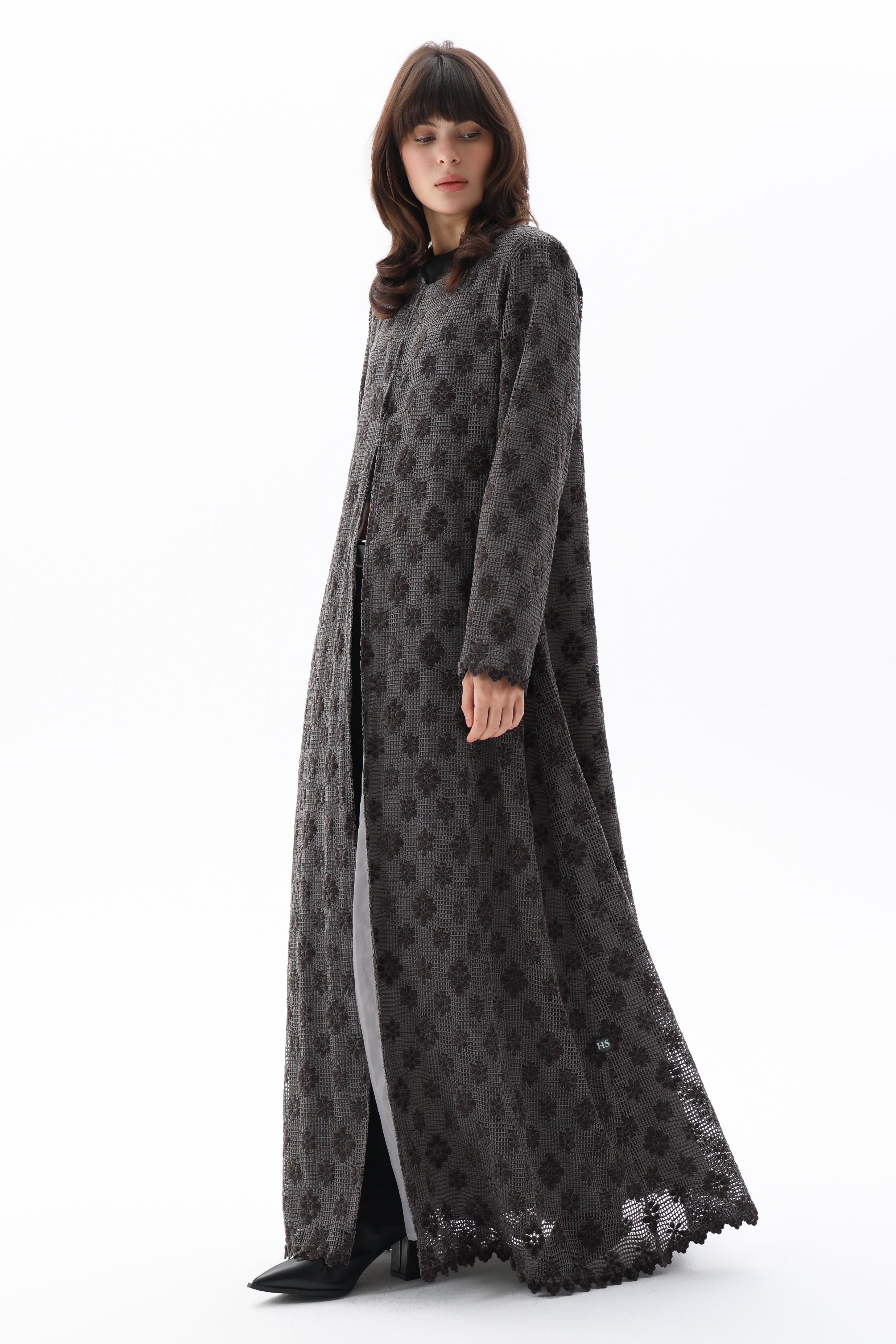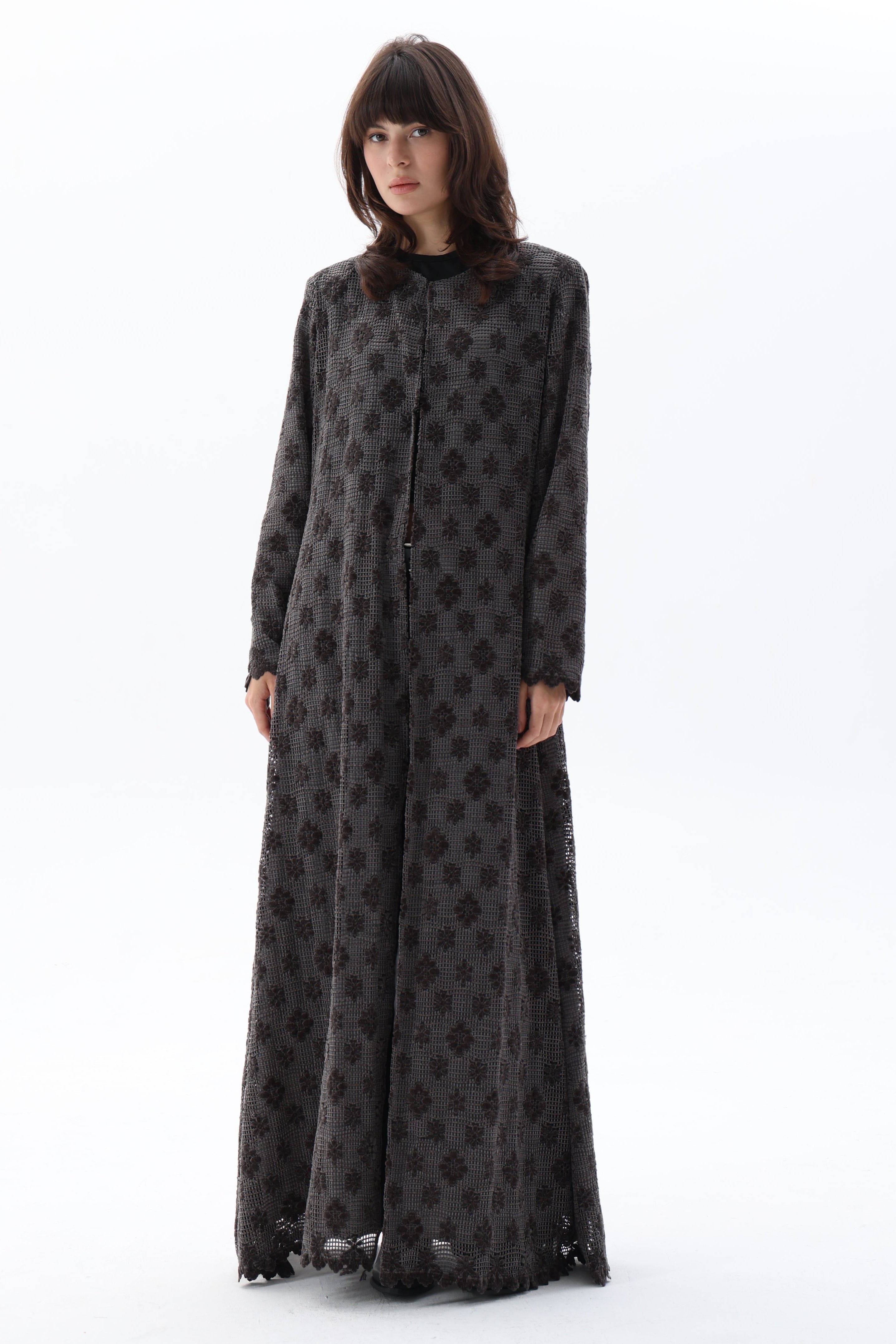 Kenza- This abaya showcases a tailored straight silhouette with structured shoulder padding for a polished appearance. Luxurious velvet lace combines with dimensional floral embroidery, creating textural sophistication throughout the piece. A refined selection for those seeking contemporary styling with meticulous artisanal detailing.