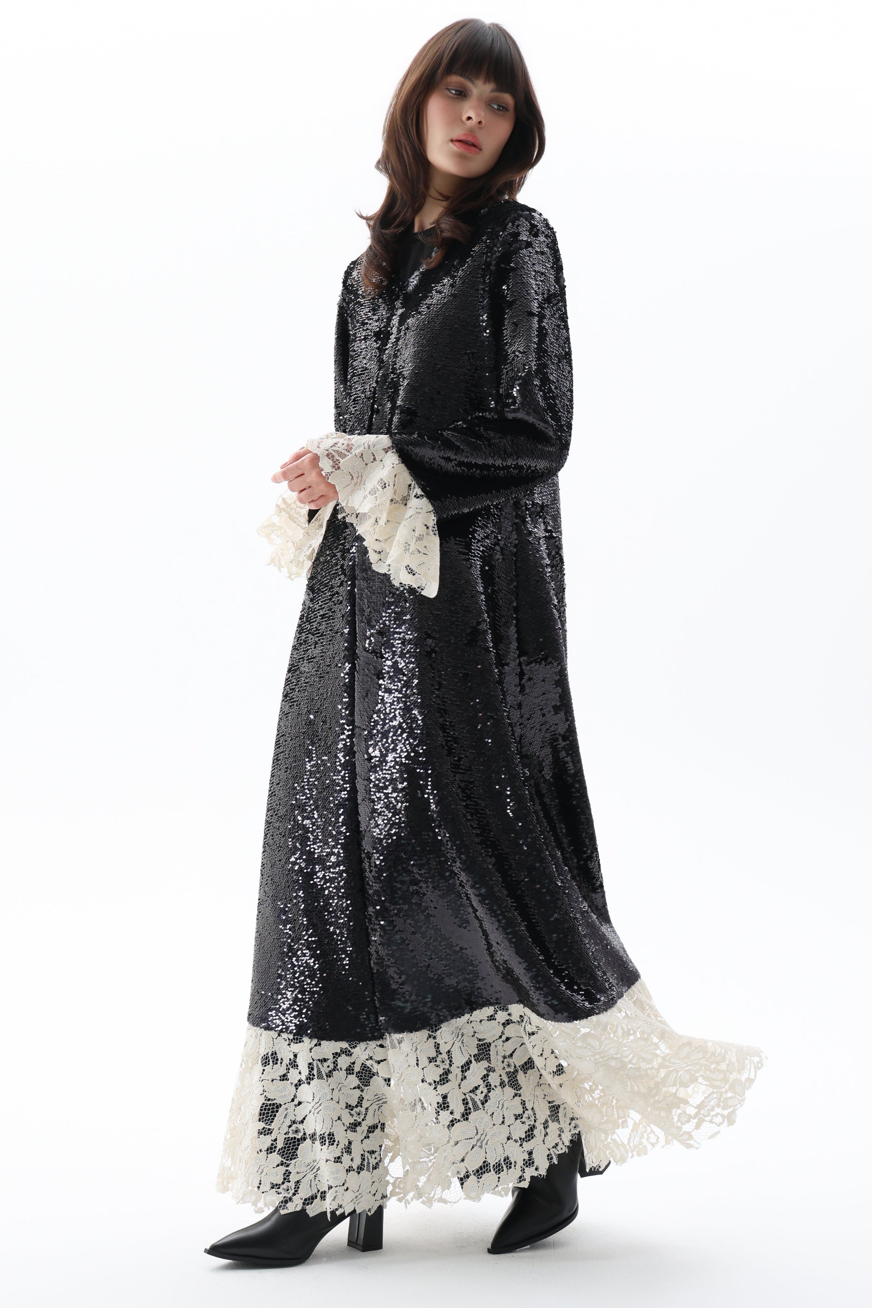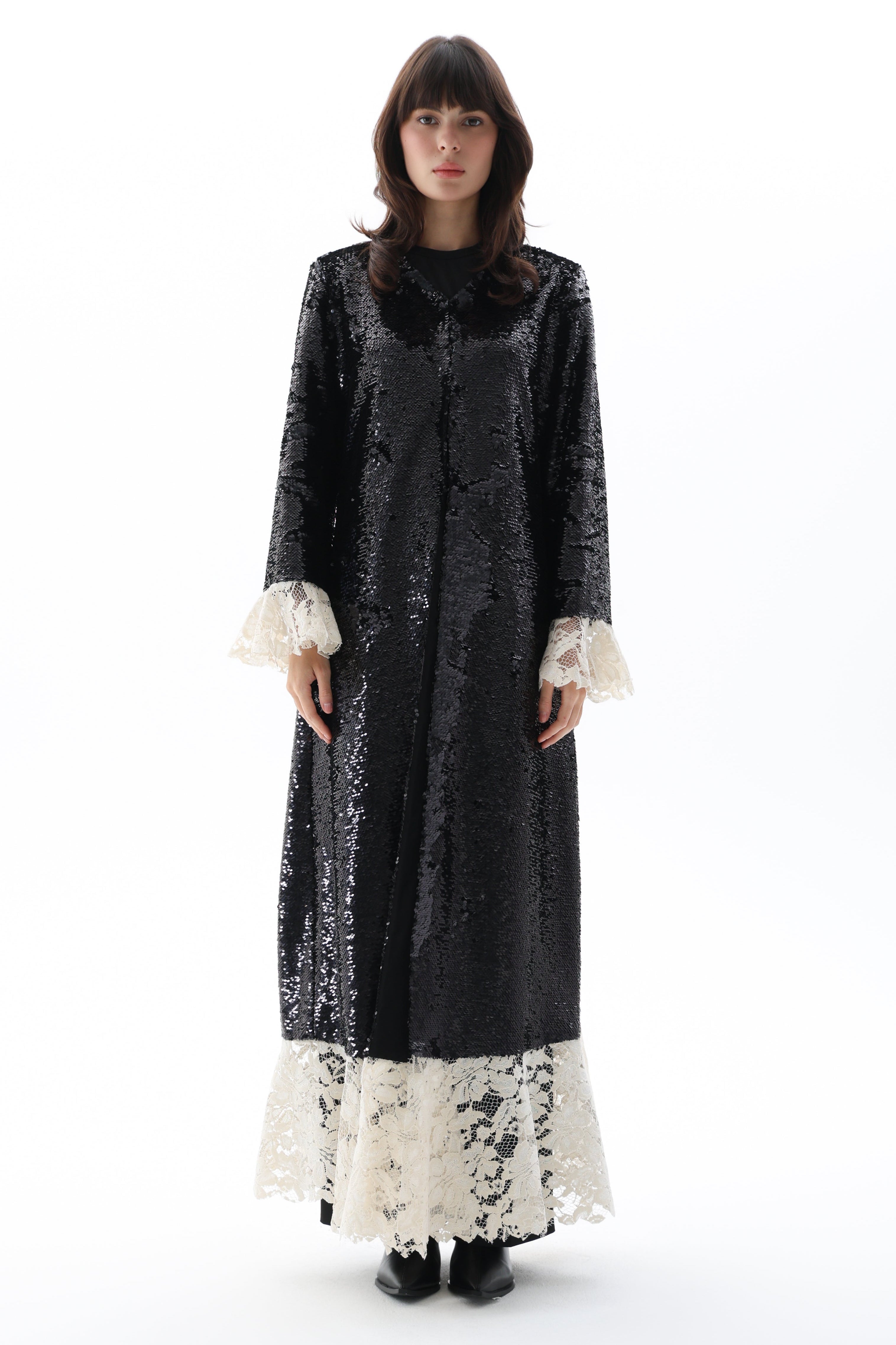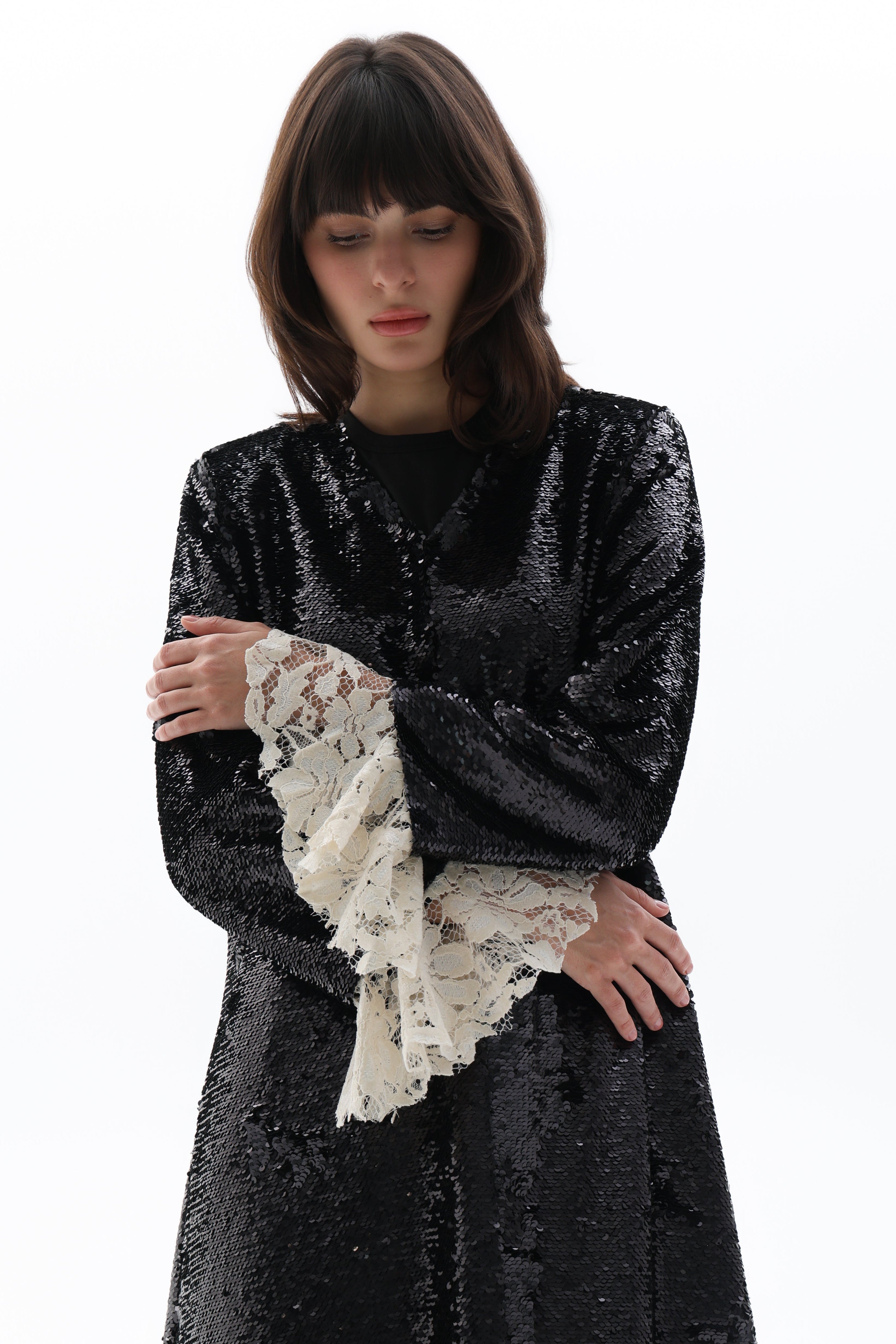 Leona- showcases a streamlined silhouette crafted from refined crepe fabric. Luxurious velvet lace detailing adorns the sleeves and chest area, introducing textural sophistication to the clean lines.