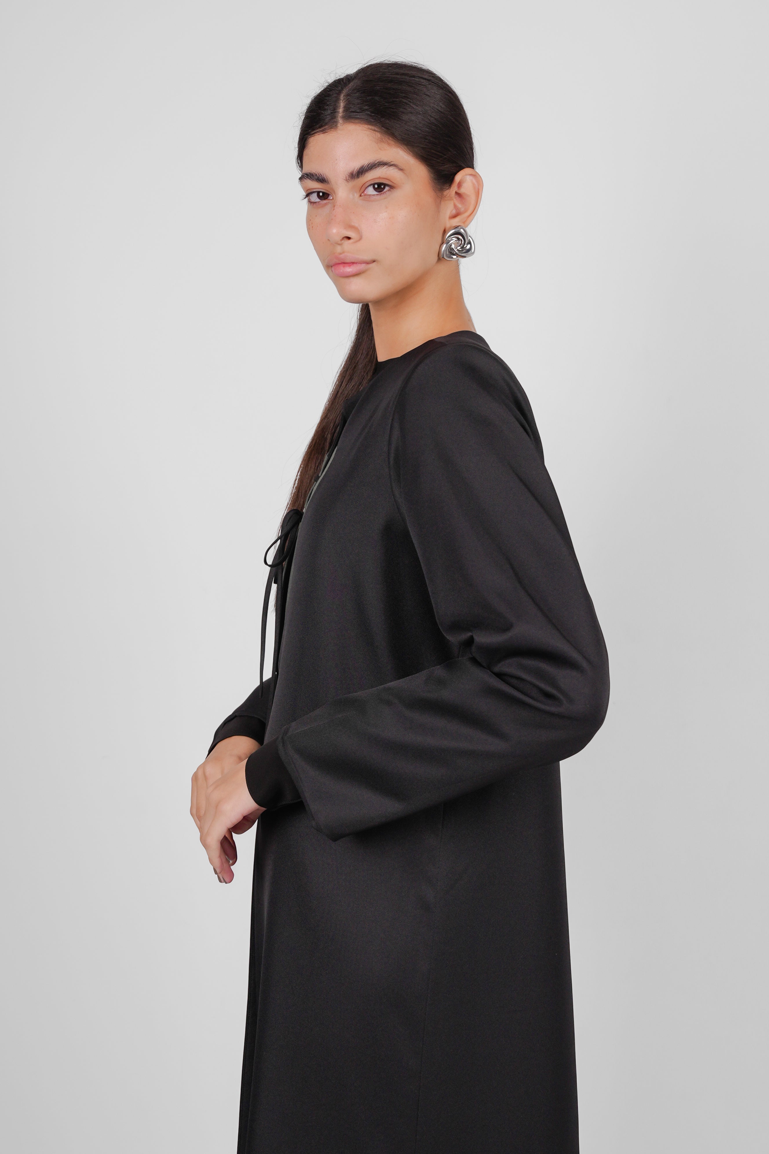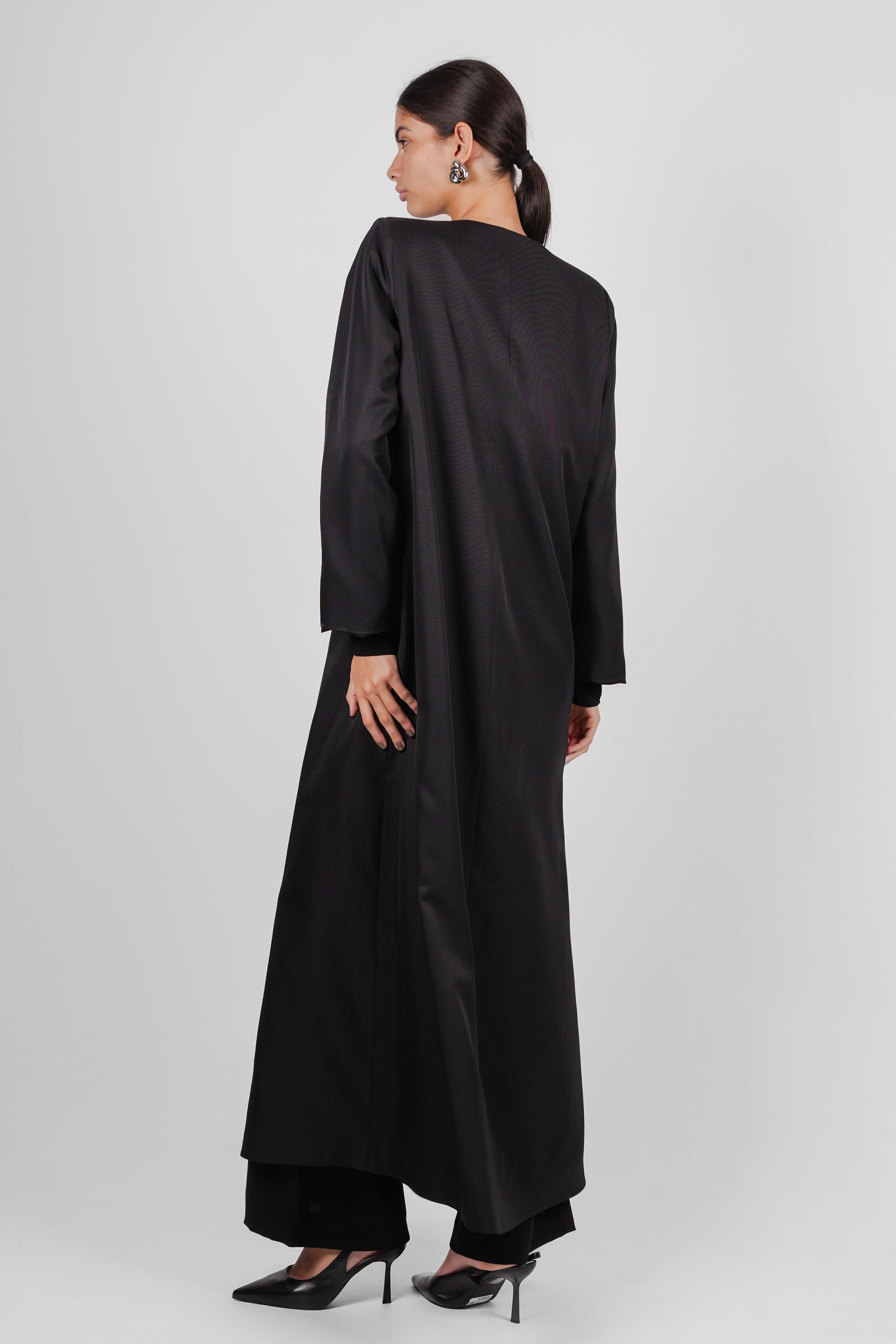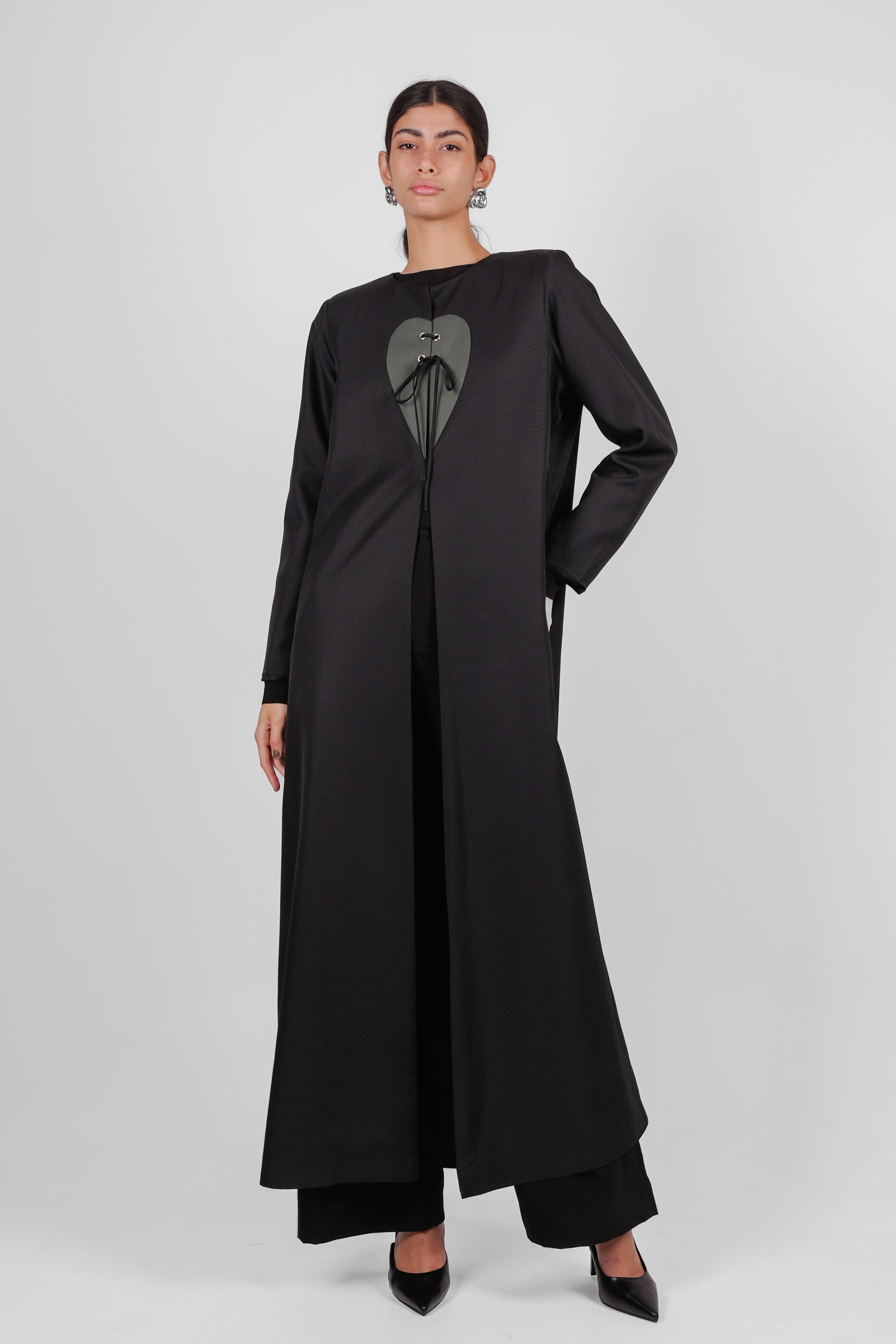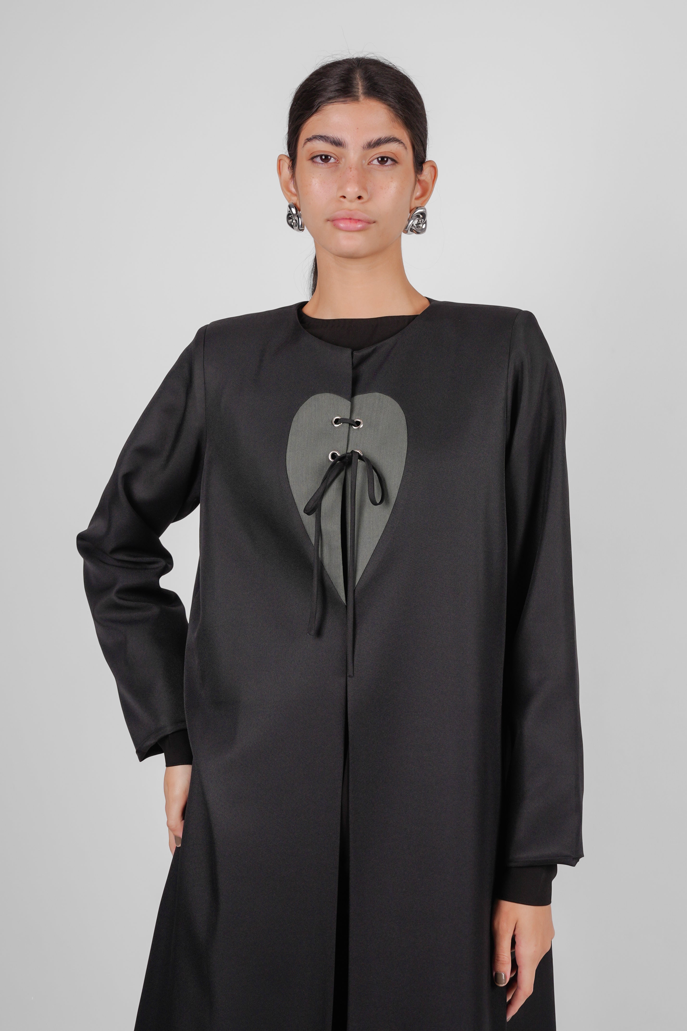 LUME-A blazer - cut abaya in black with bold white heart panel at the chest, accented by a lace-up tie detail.
