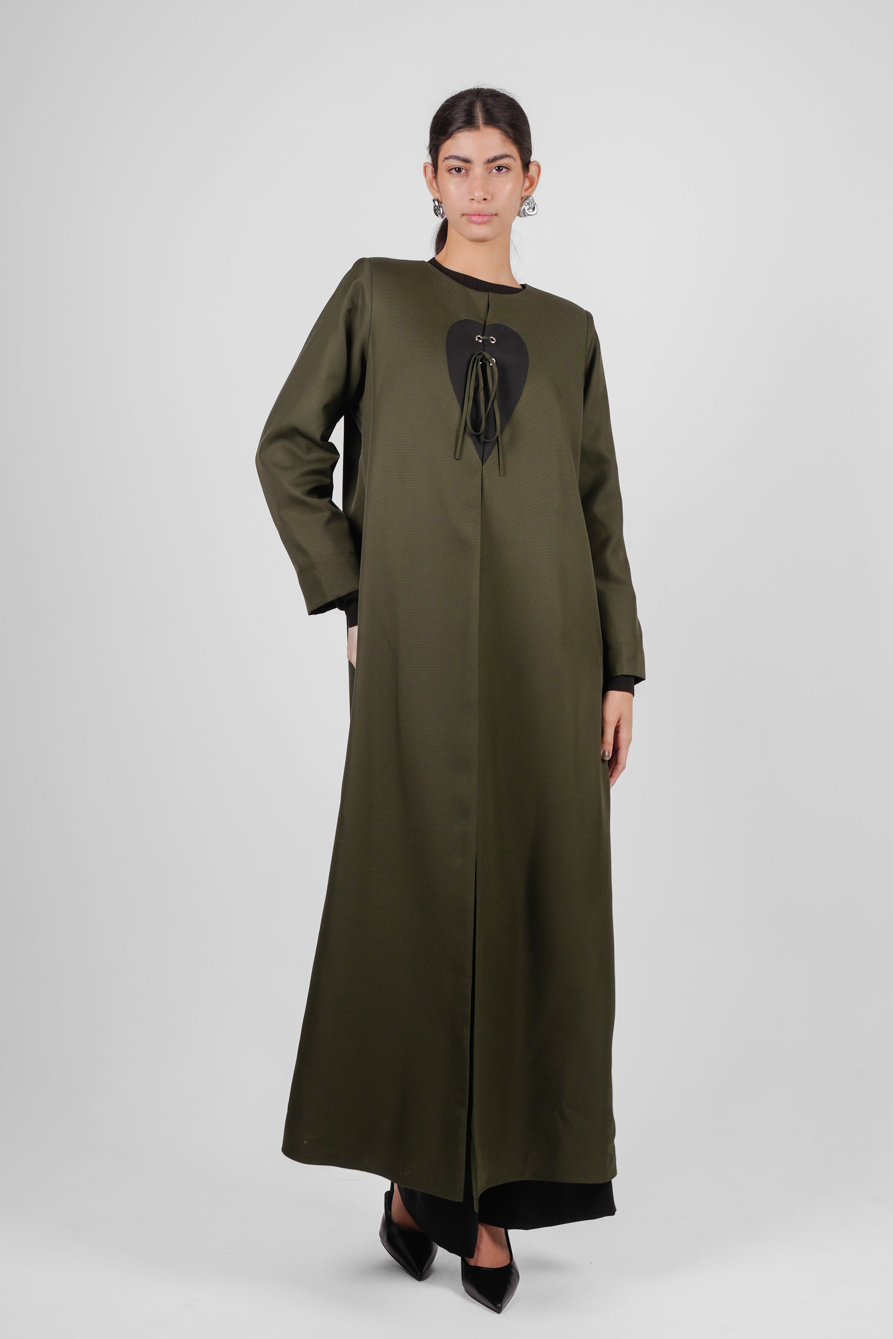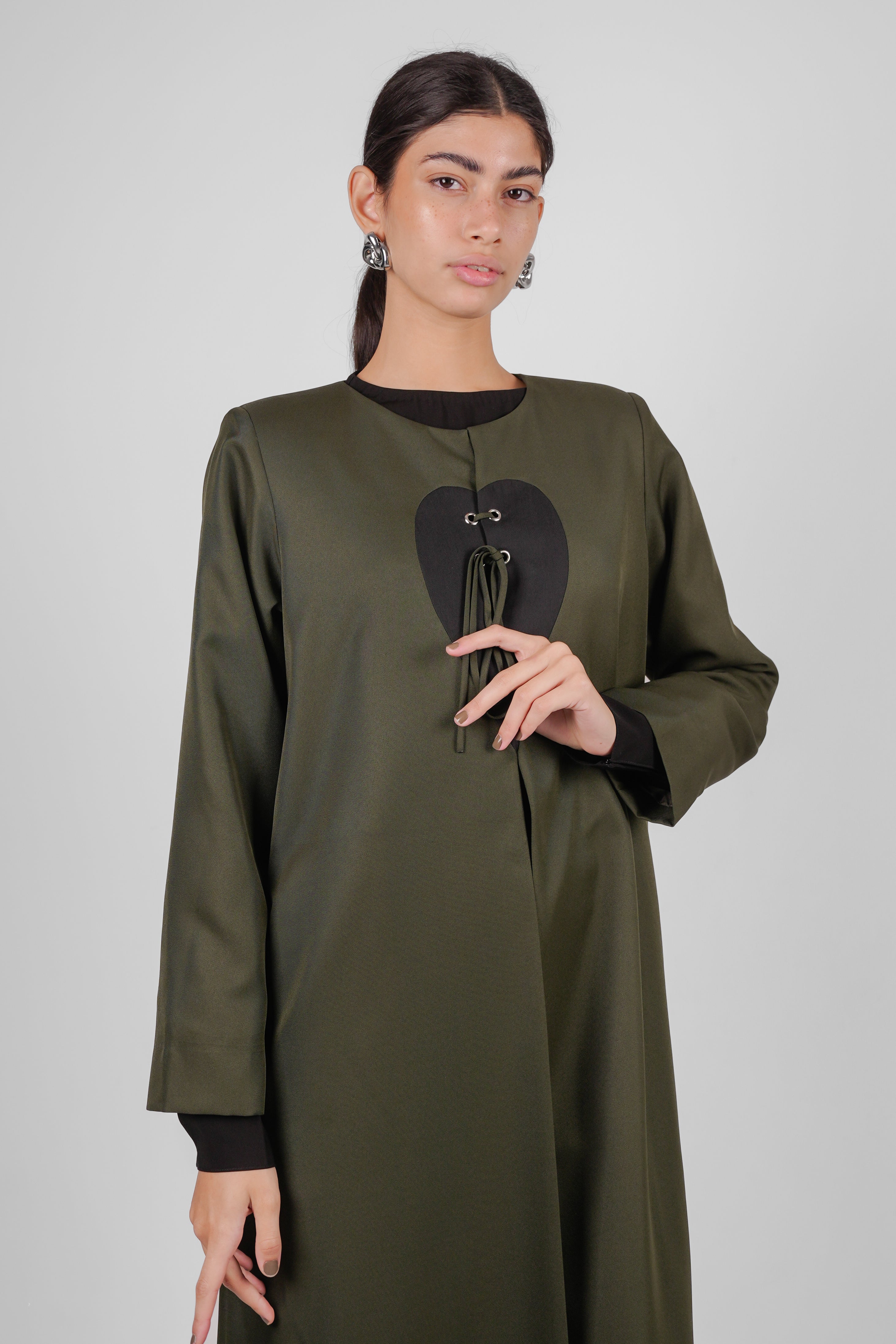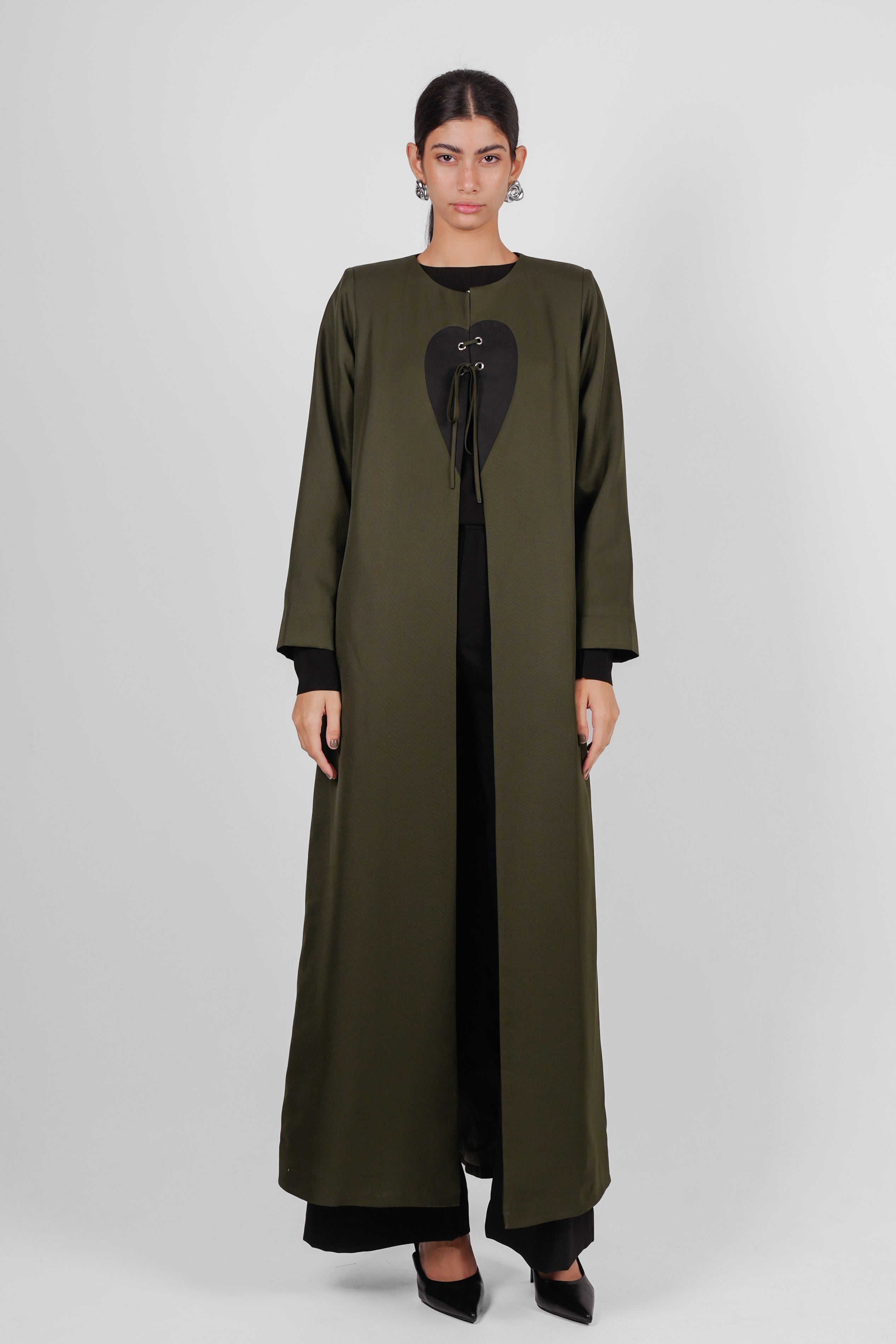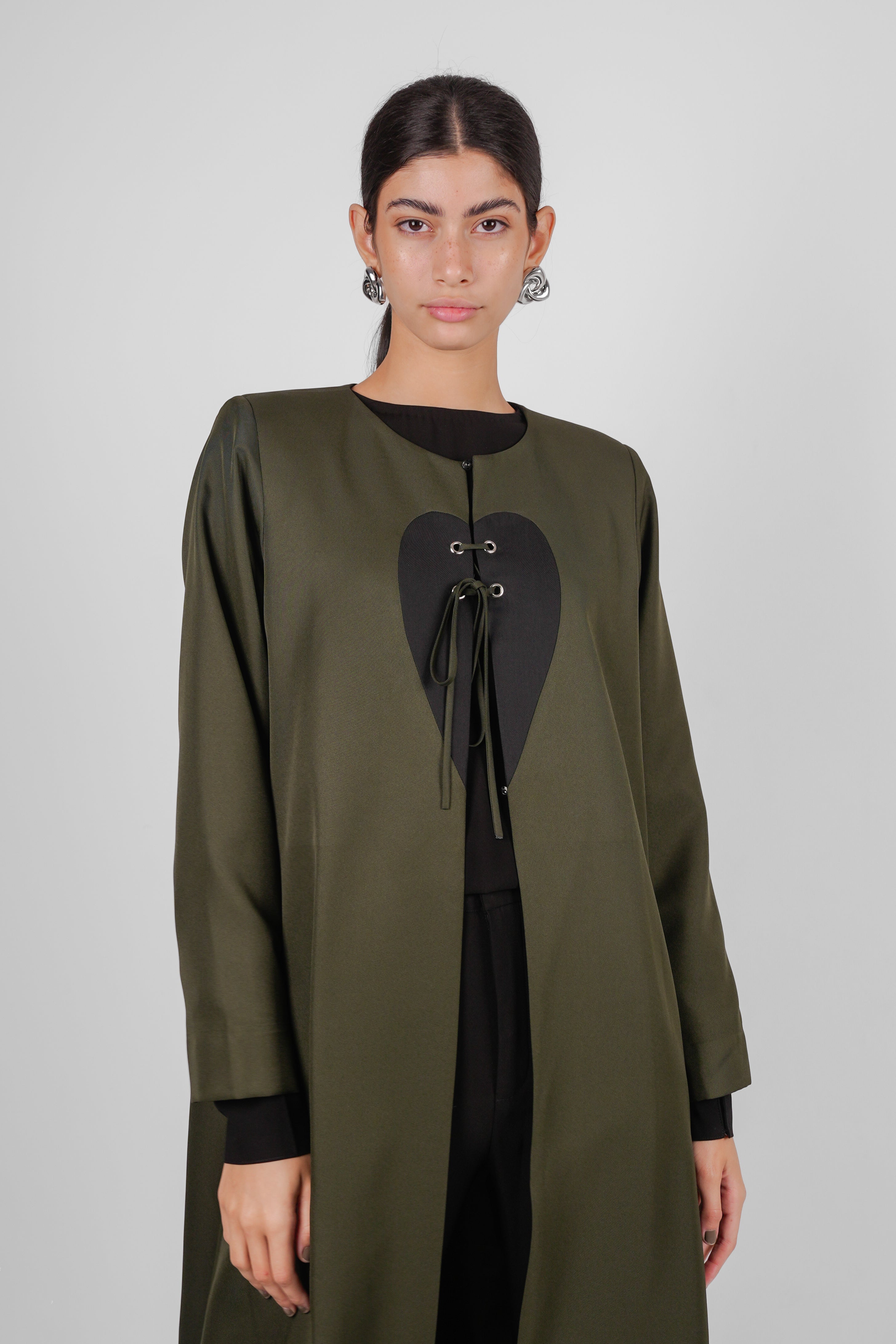 LUME-A blazer - cut abaya in green with bold white heart panel at the chest, accented by a lace-up tie detail.
