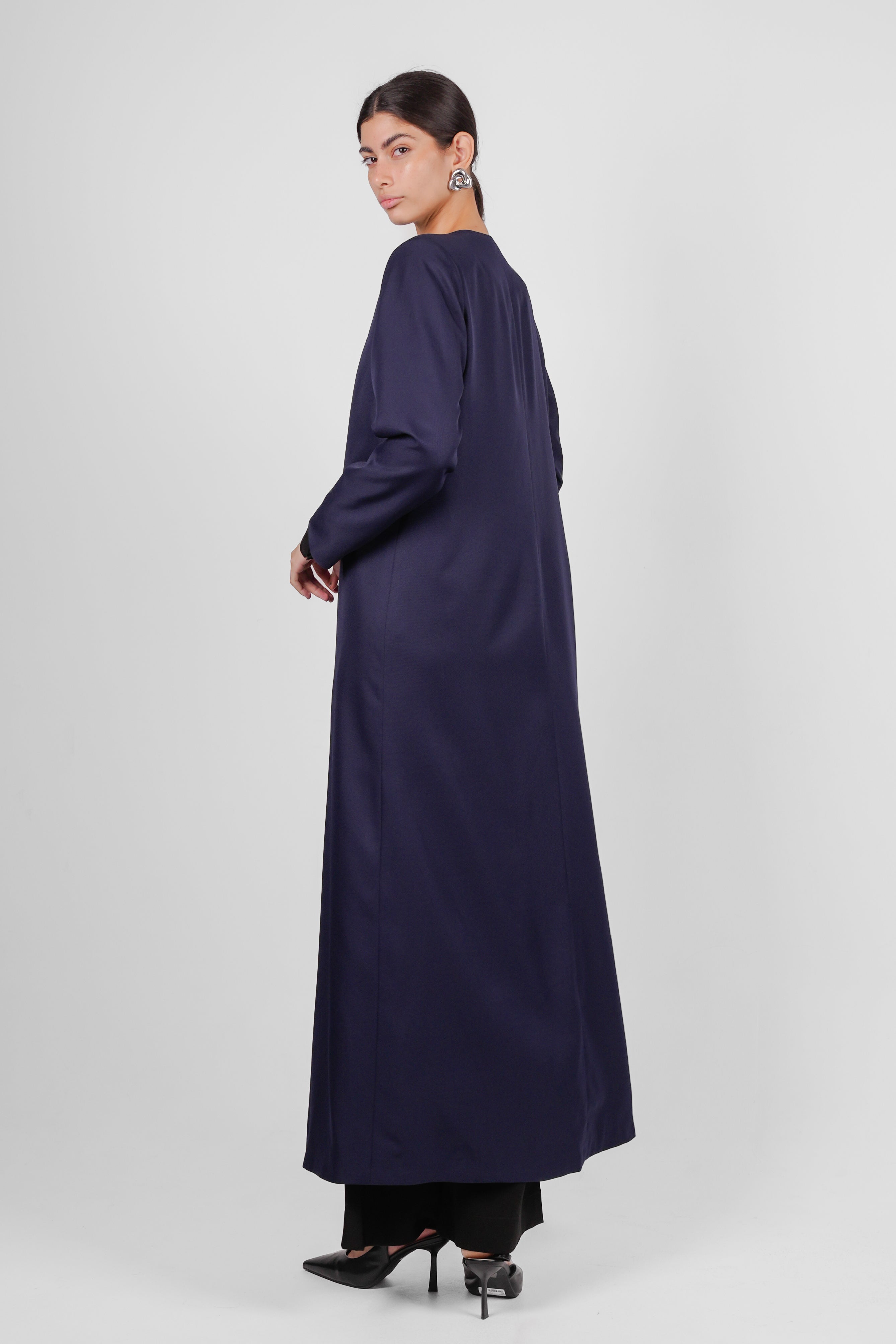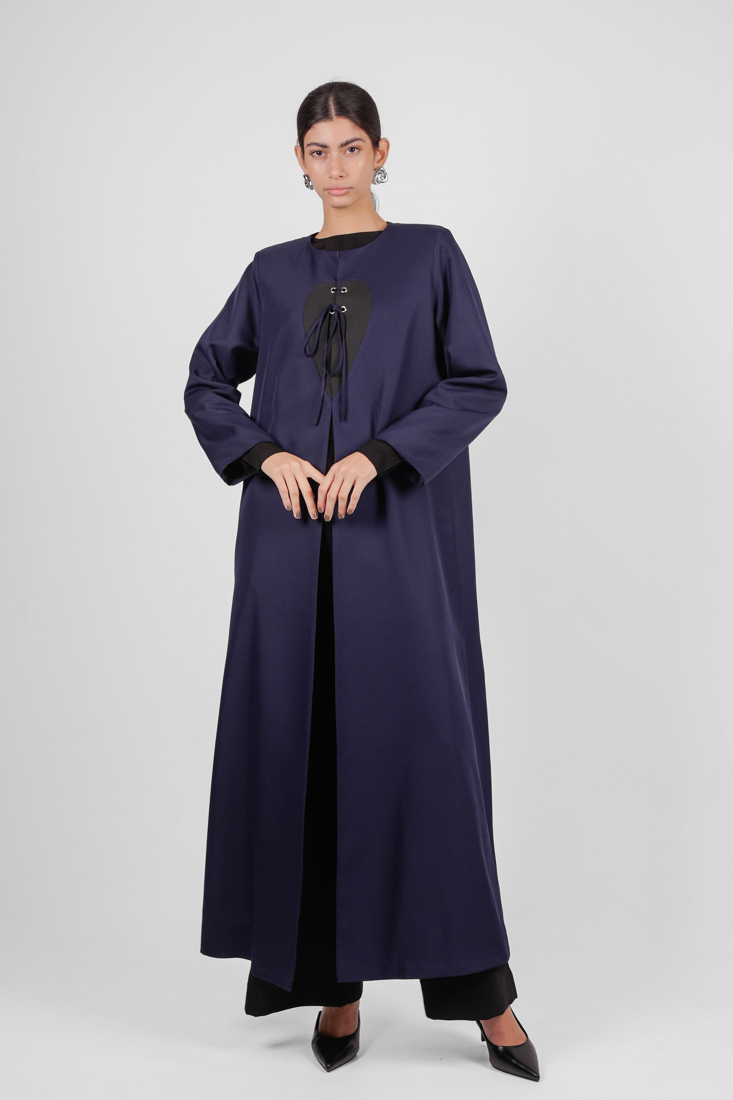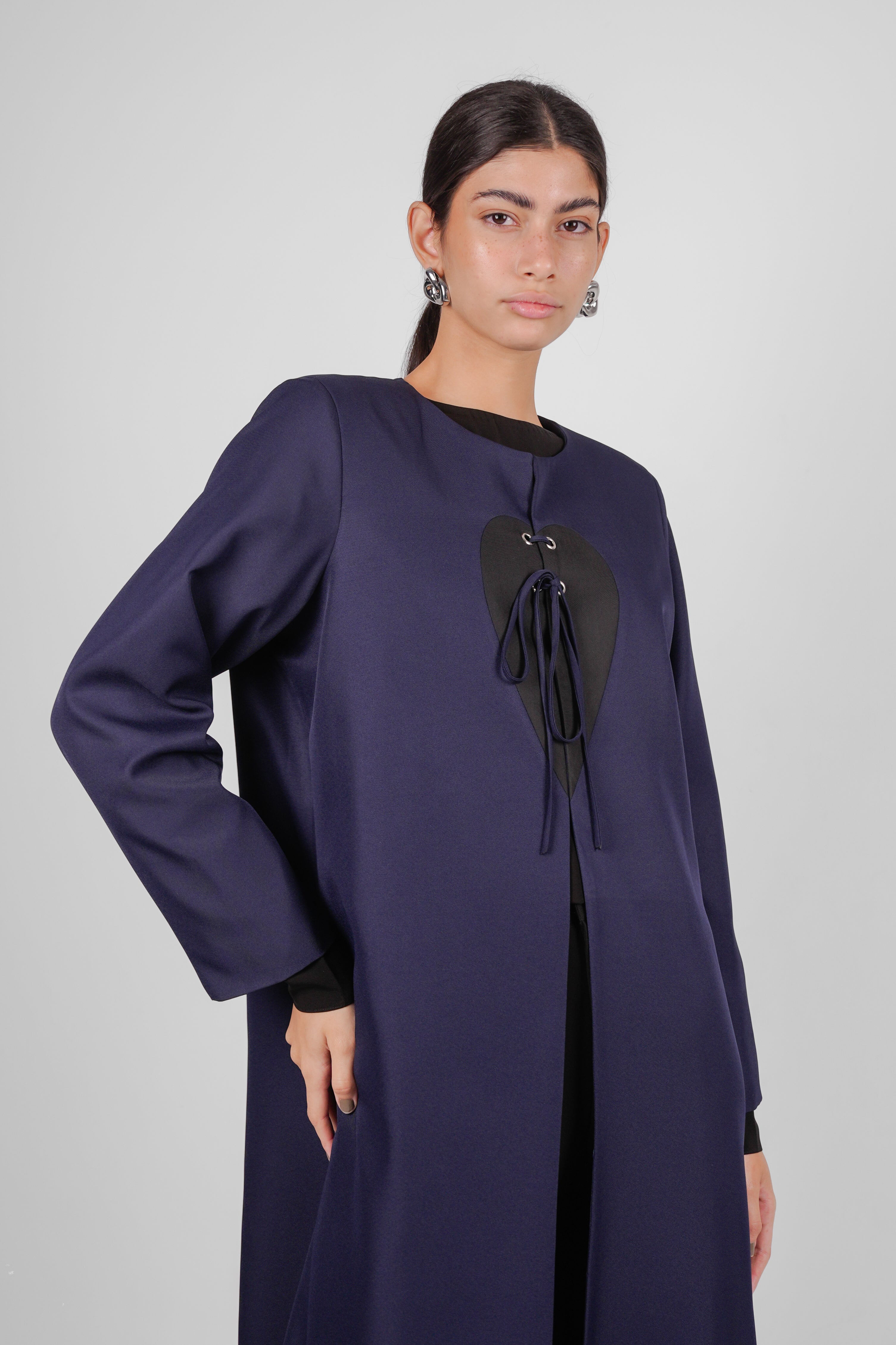 LUME-A blazer - cut abaya in navy with bold black heart panel at the chest, accented by a lace-up tie detail.