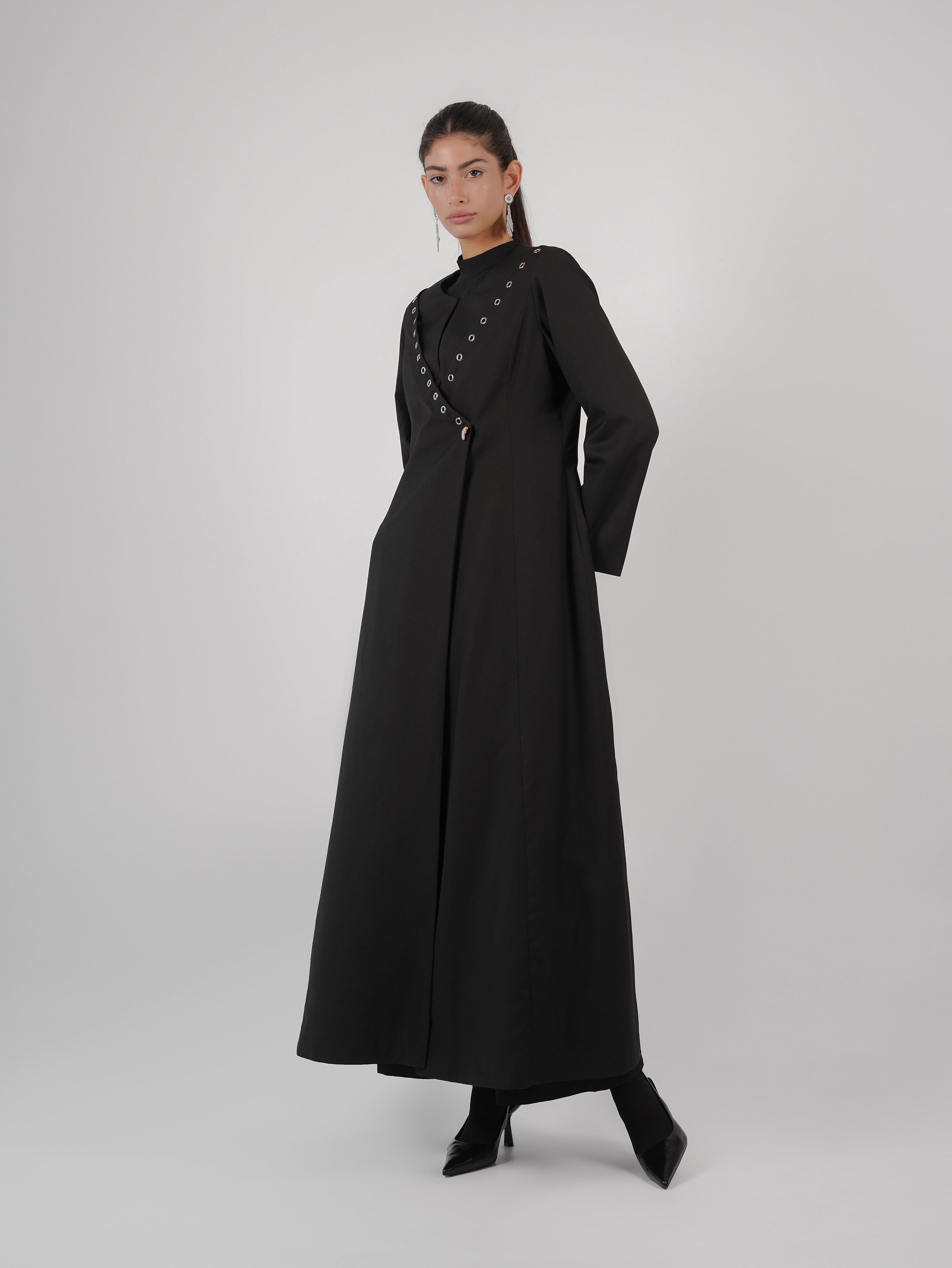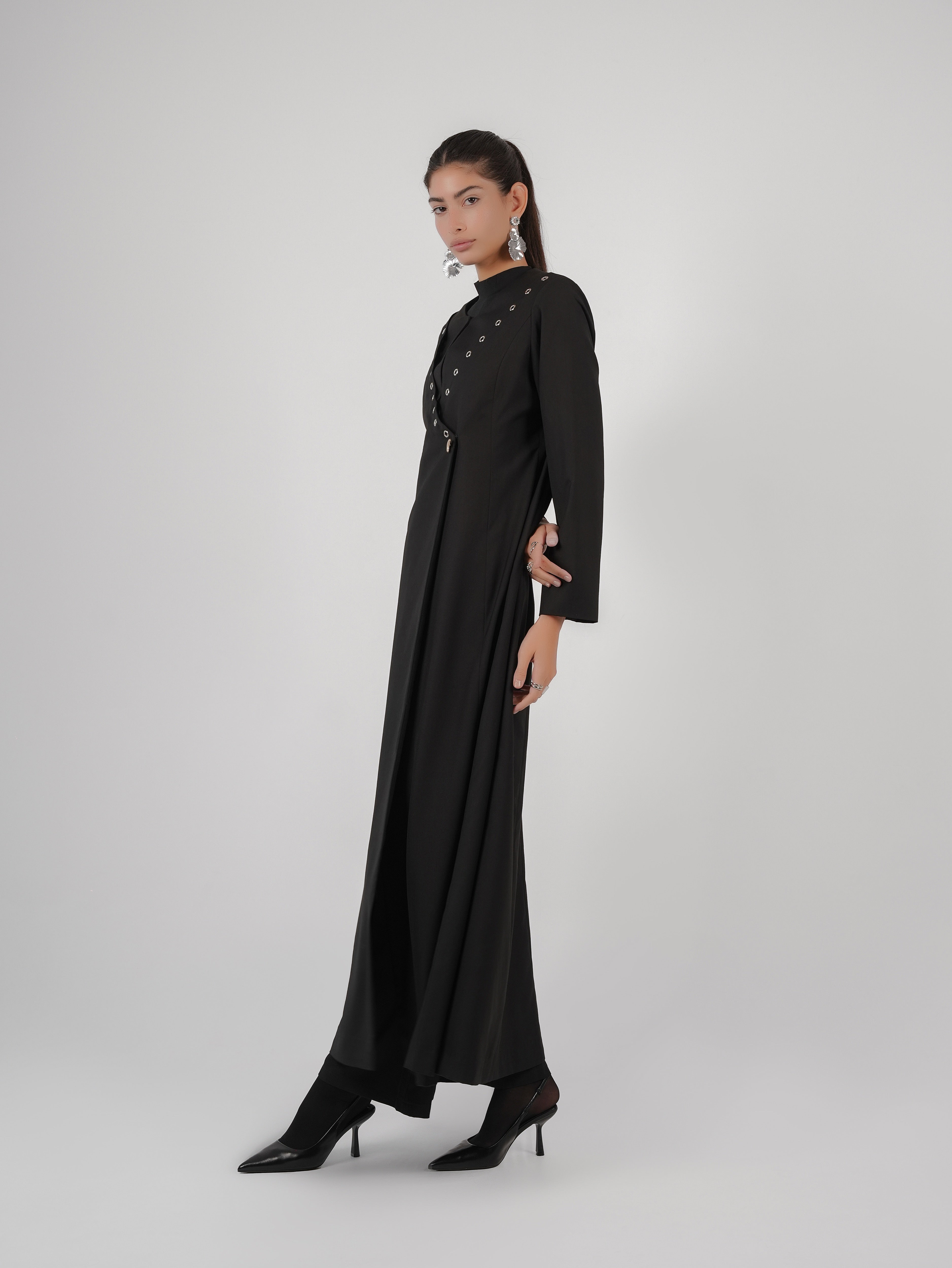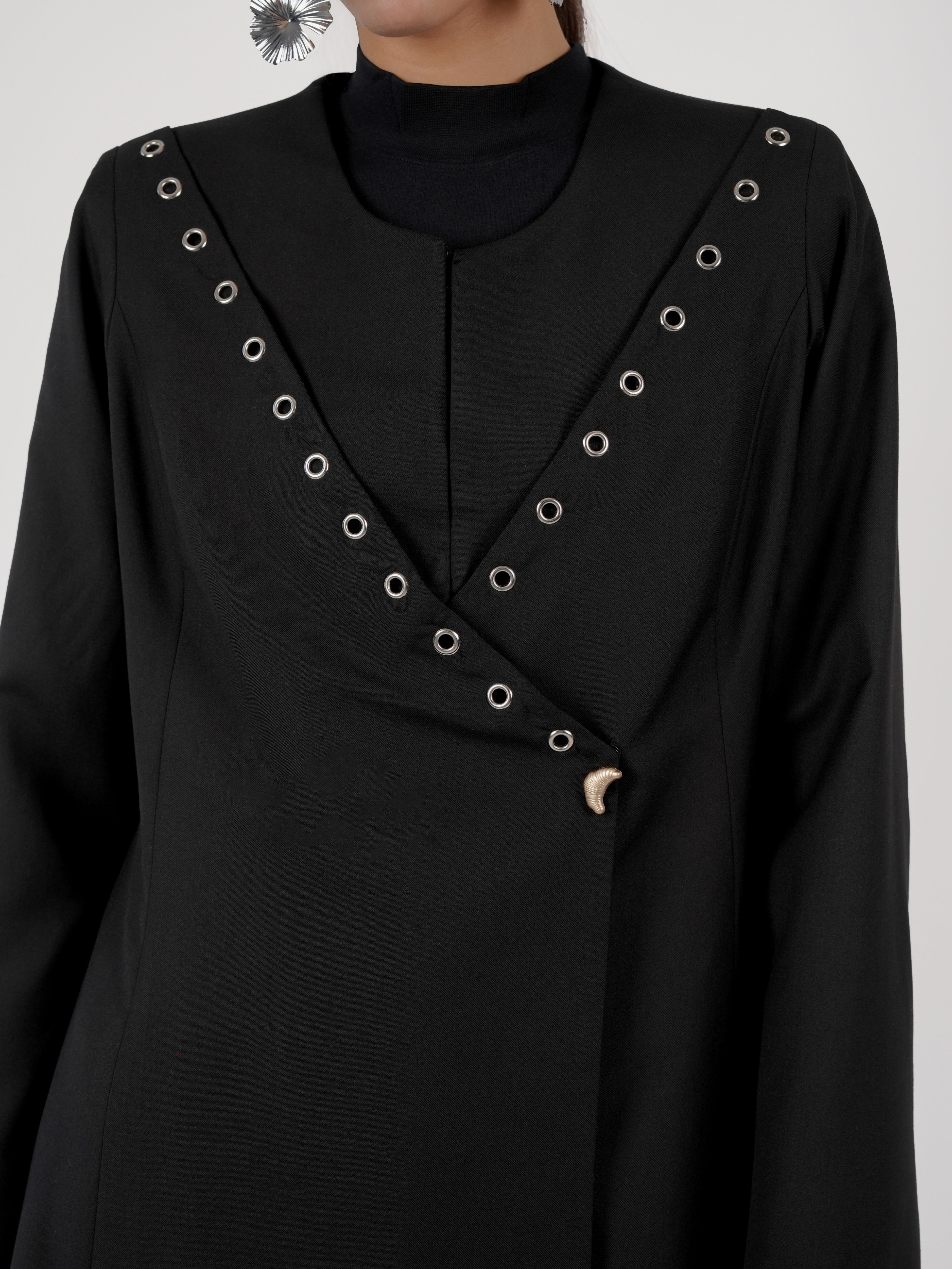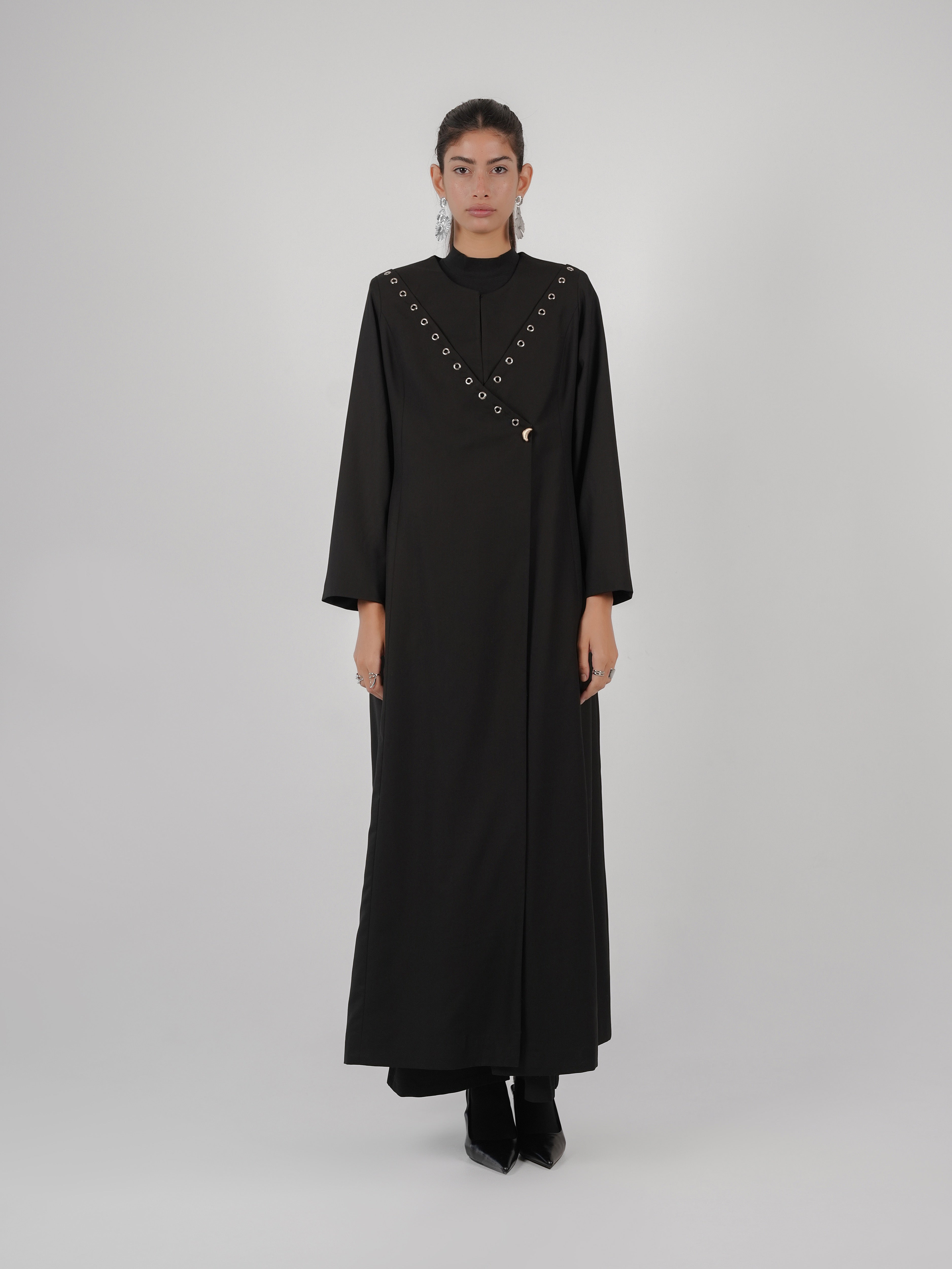 ORBIT-Structured abaya that has everything in symmetry and brings out a proper formal look with its lapel shape and eyelet details for the work day ahead.