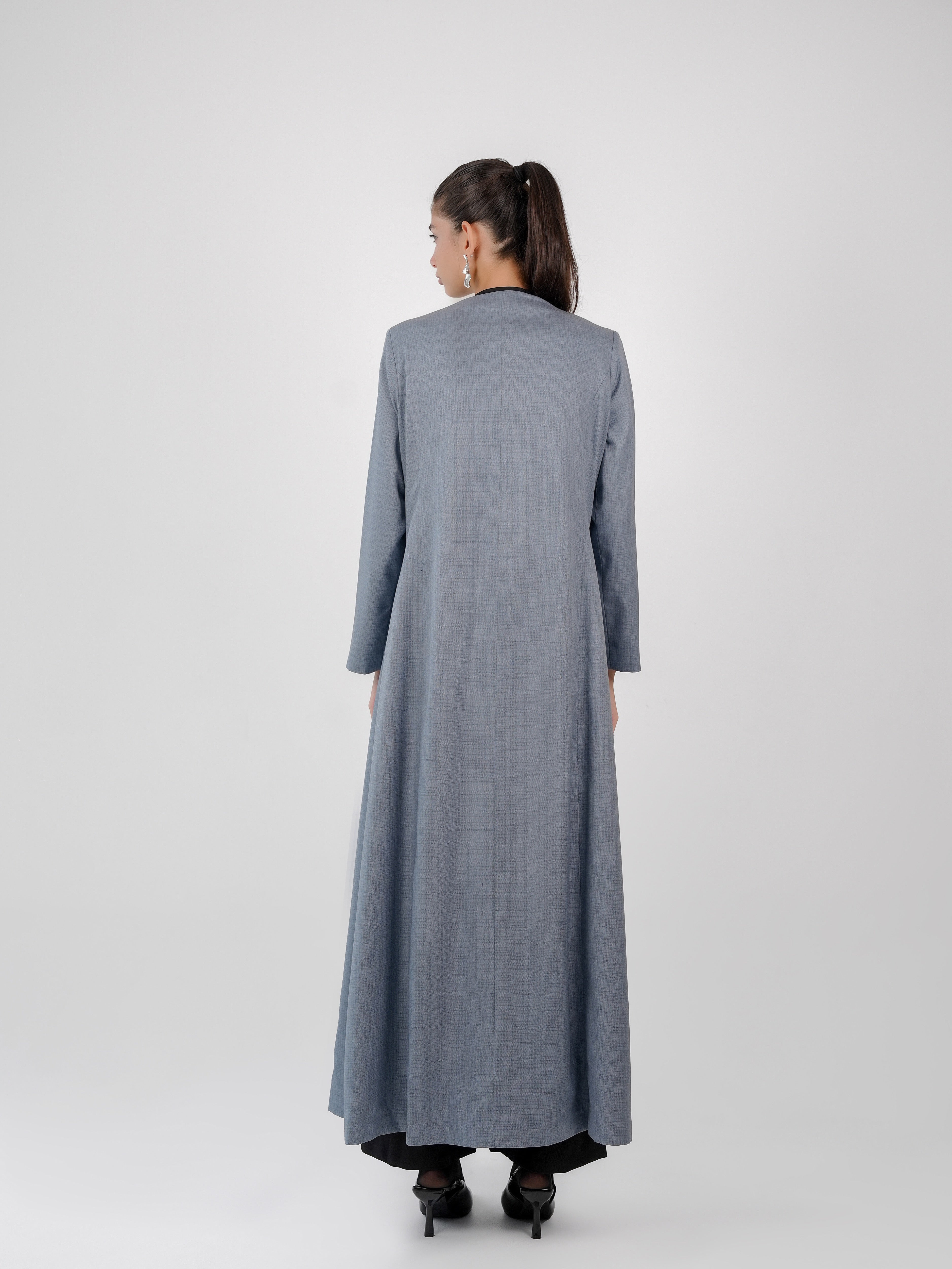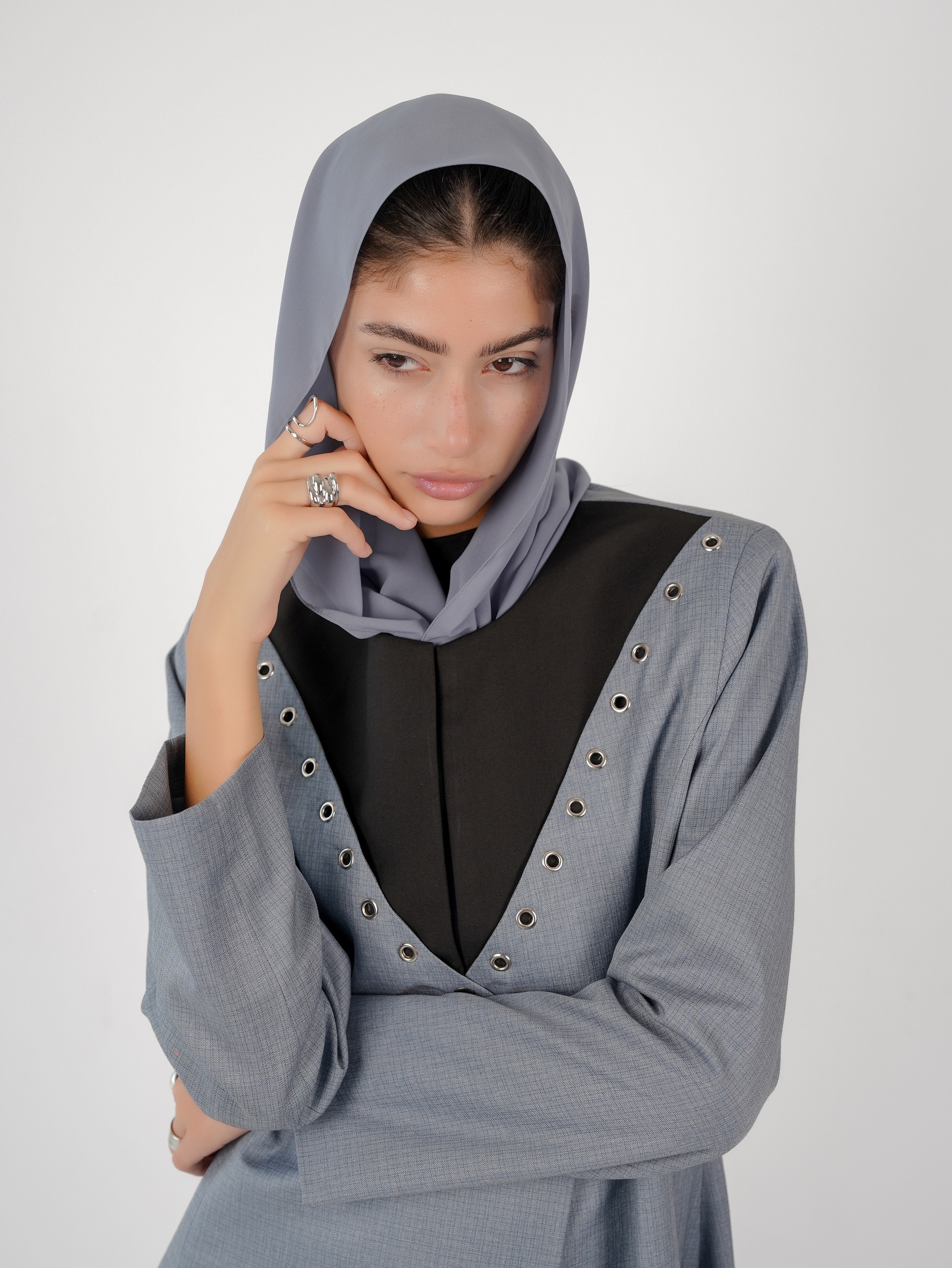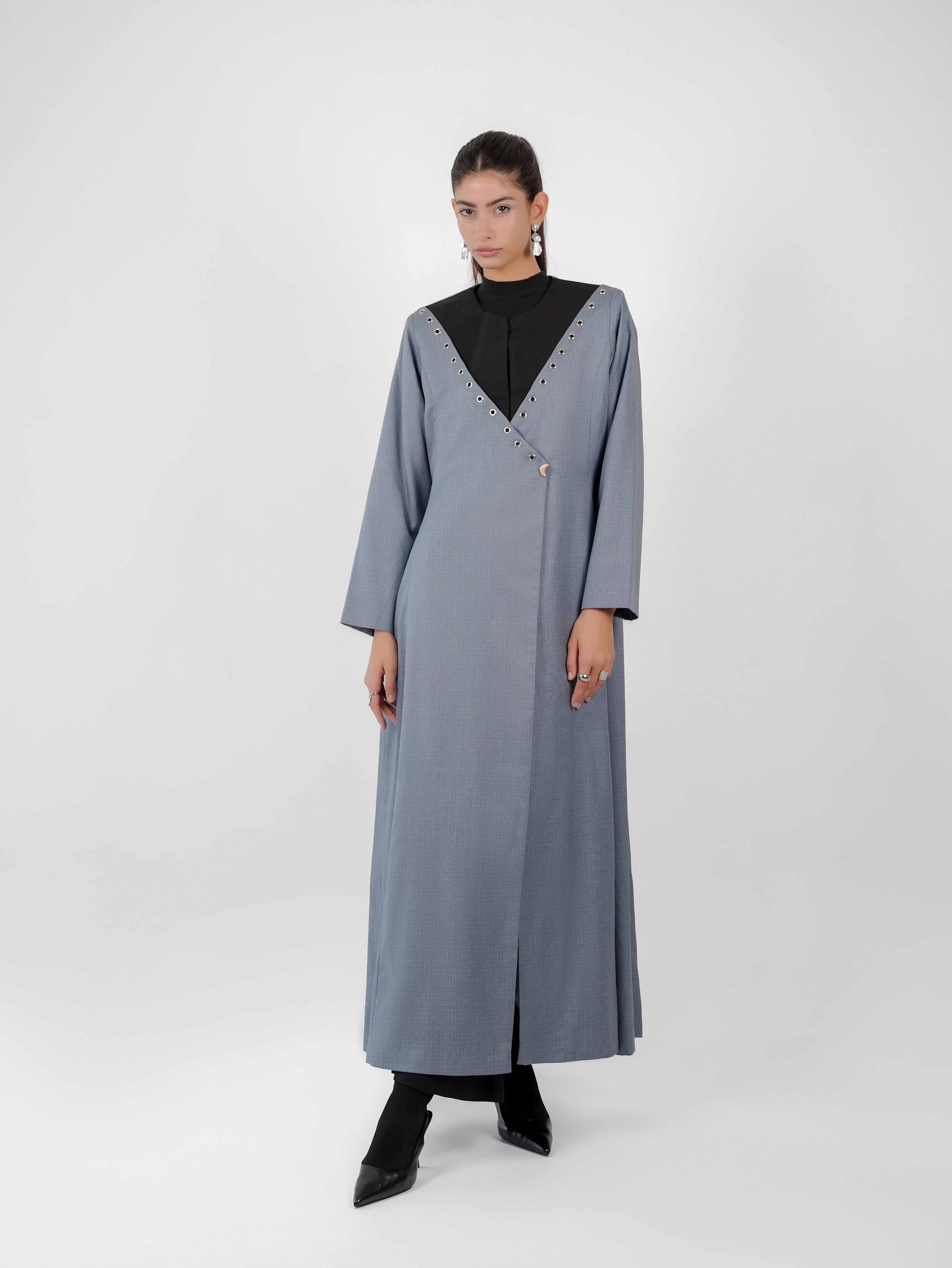 ORBIT-Structured abaya that has everything in symmetry and brings out a proper formal look with its lapel shape and eyelet details for the work day ahead.