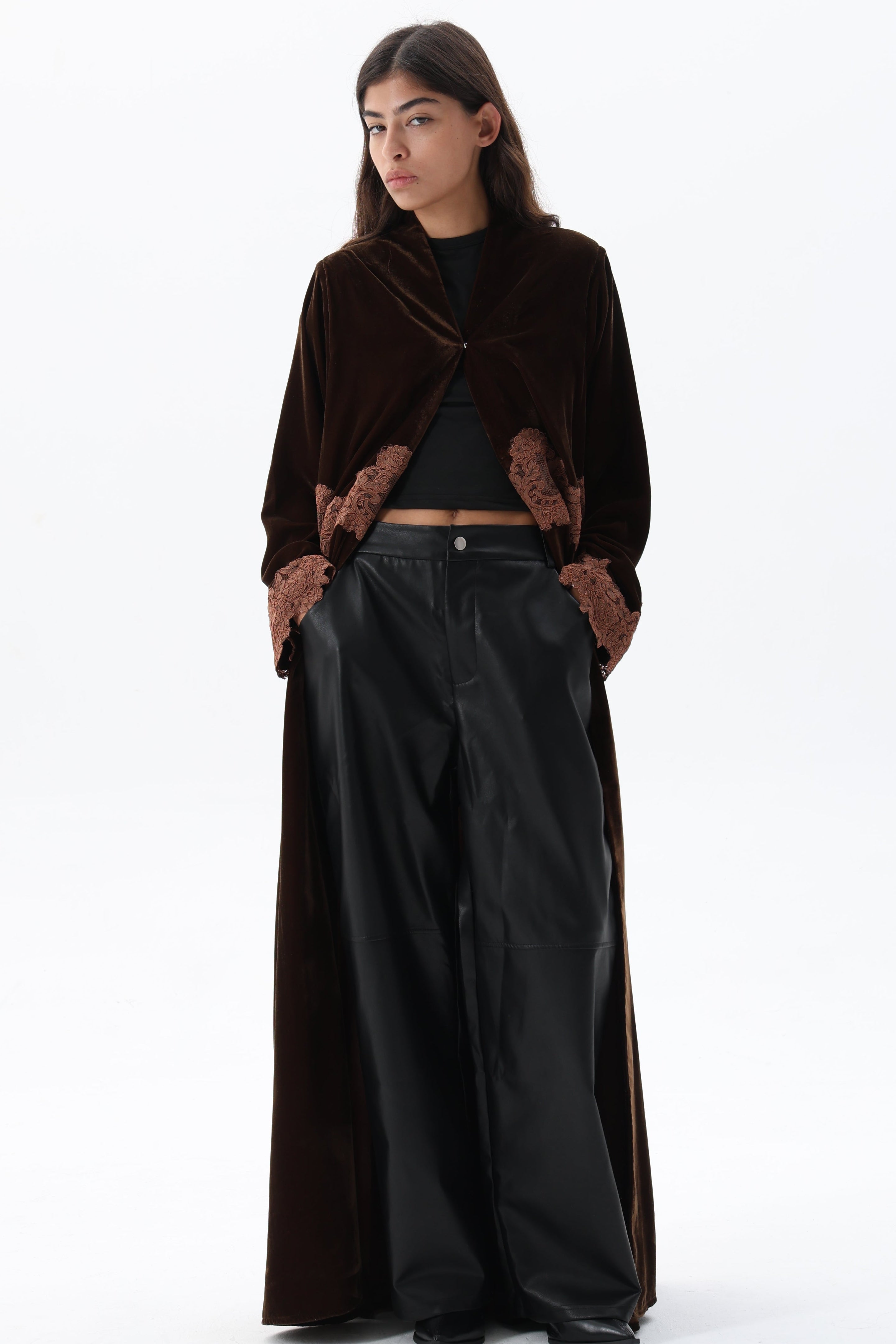 Sophia- This abaya showcases luxurious velvet fabric enhanced with dimensional 3D lace detailing.