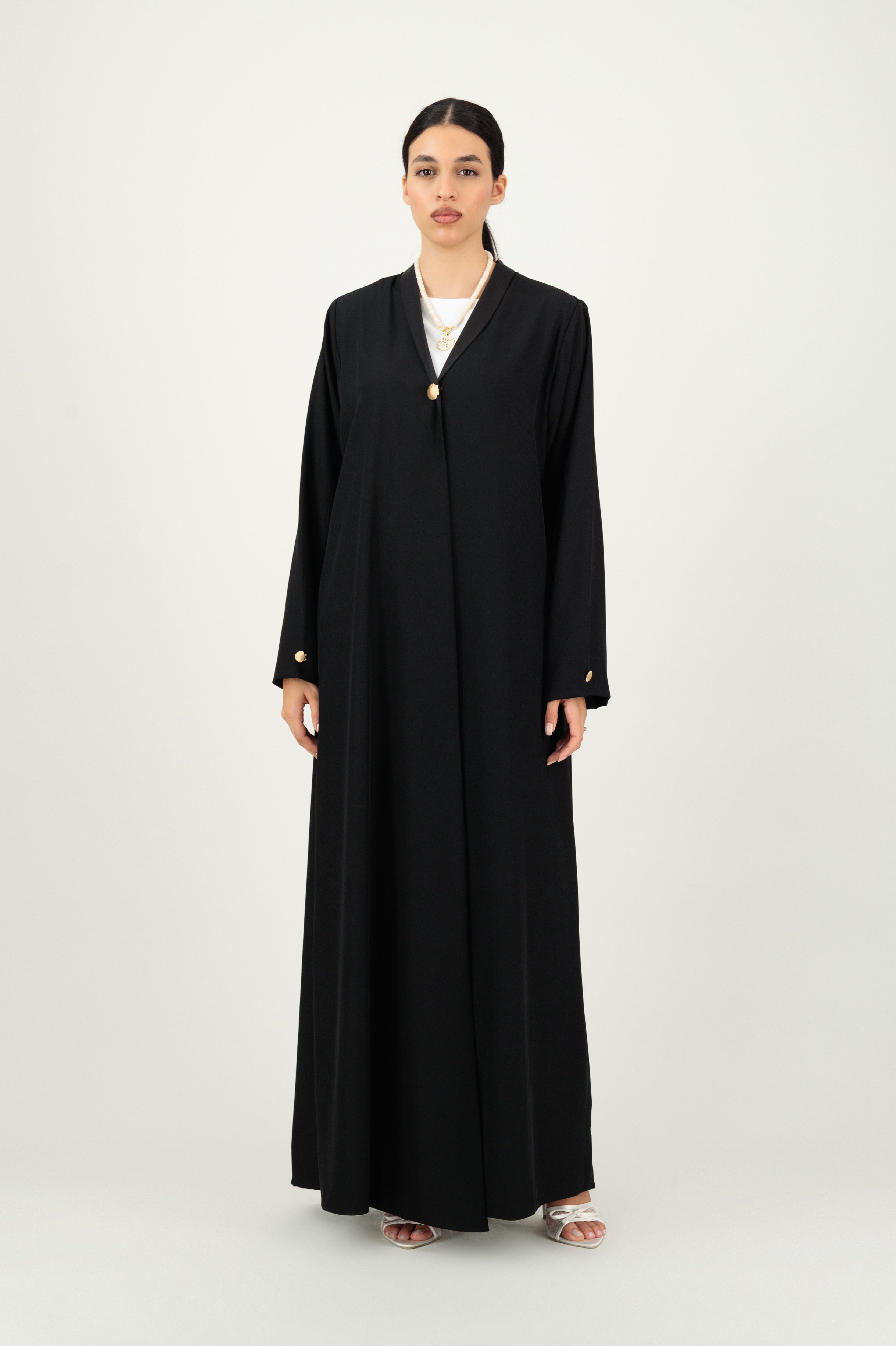 A refined abaya crafted from a silk-crepe blend, featuring a sleek folded collar and a signature golden button. Elegant, lightweight, and perfect for both day and evening wear.