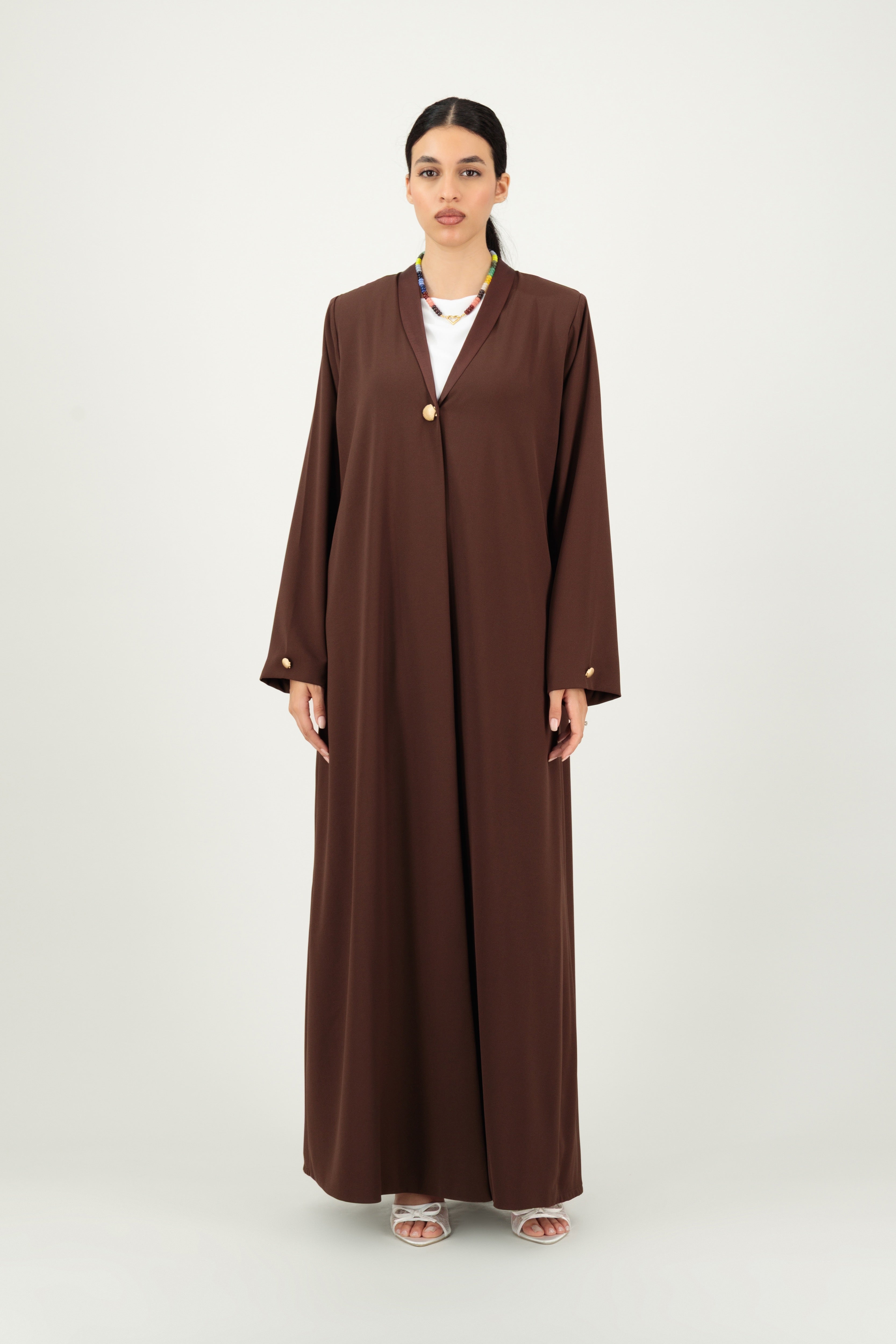 A refined abaya crafted from a silk-crepe blend, featuring a sleek folded collar and a signature golden button. Elegant, lightweight, and perfect for both day and evening wear.