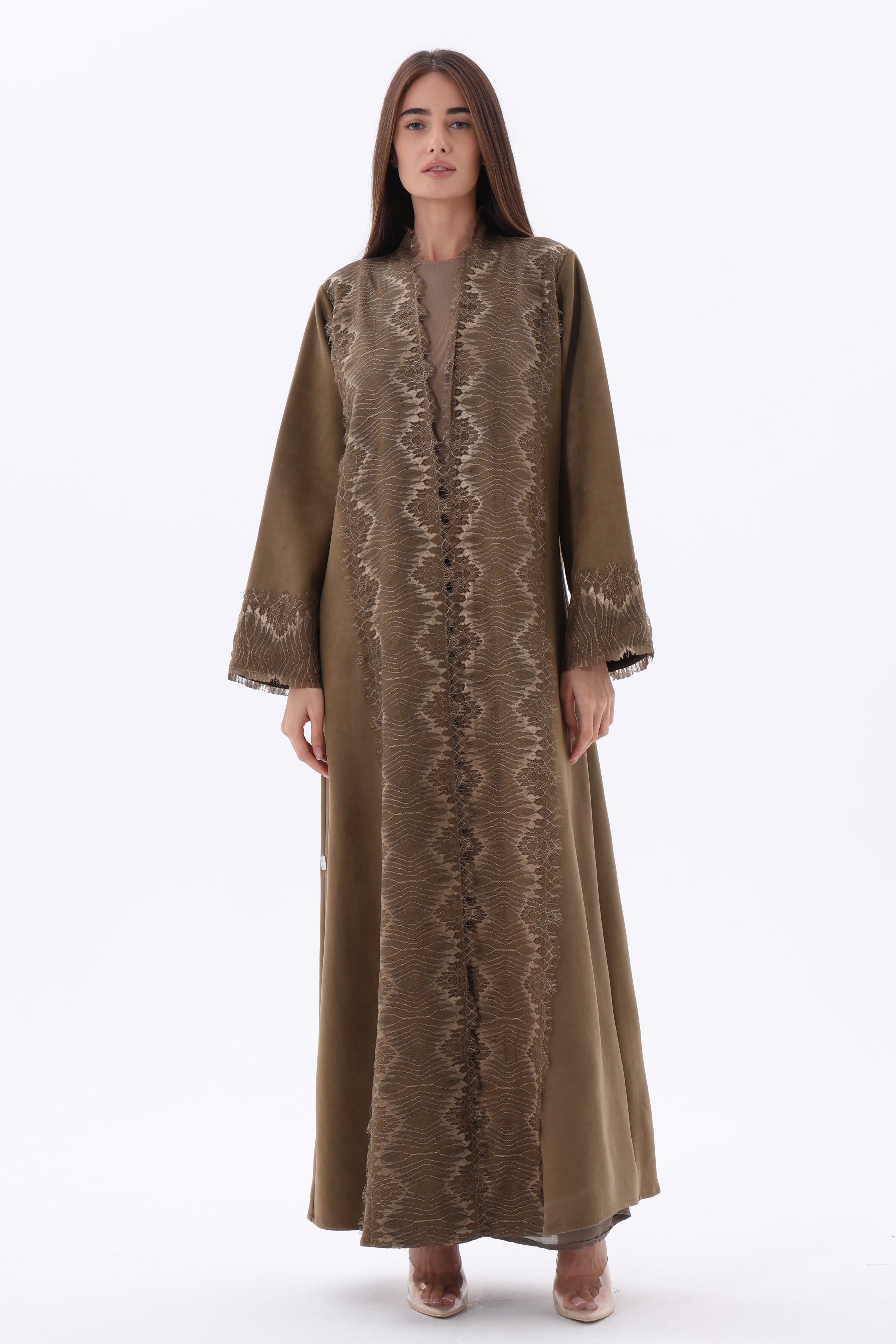 Wendy - Discover versatile elegance with this refined abaya crafted from soft suede and adorned with delicate French lace detailing. The optional lace sheela adds a customizable touch, allowing you to transition seamlessly from everyday wear to special occasions. A sophisticated wardrobe essential that balances comfort with timeless style.